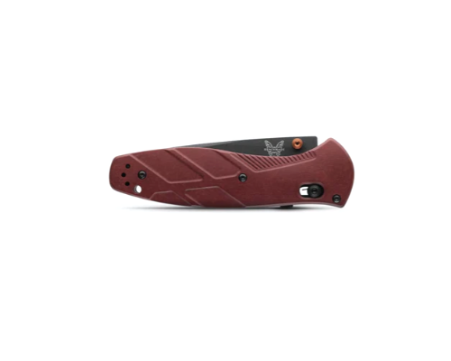 This Benchmade, Inc. Barrage knife utilizes a 3 5/8" Locking Drop-point blade with a plain edge, swedge, 3mm thickness, and Burnt Copper thumb studs aided by a reflex spring. The blade material is CPM-S30V Stainless Steel (58-60HRC) with a Graphite Black Cerakote coating. The handle is textured, Redstone Richlite with black Axis lock, lanyard hole, and Burnt Copper reversible tip-up pocket clip. It's around 4 7/8 inches long (folded/closed) and weighs approximately 4.2 ounces.
