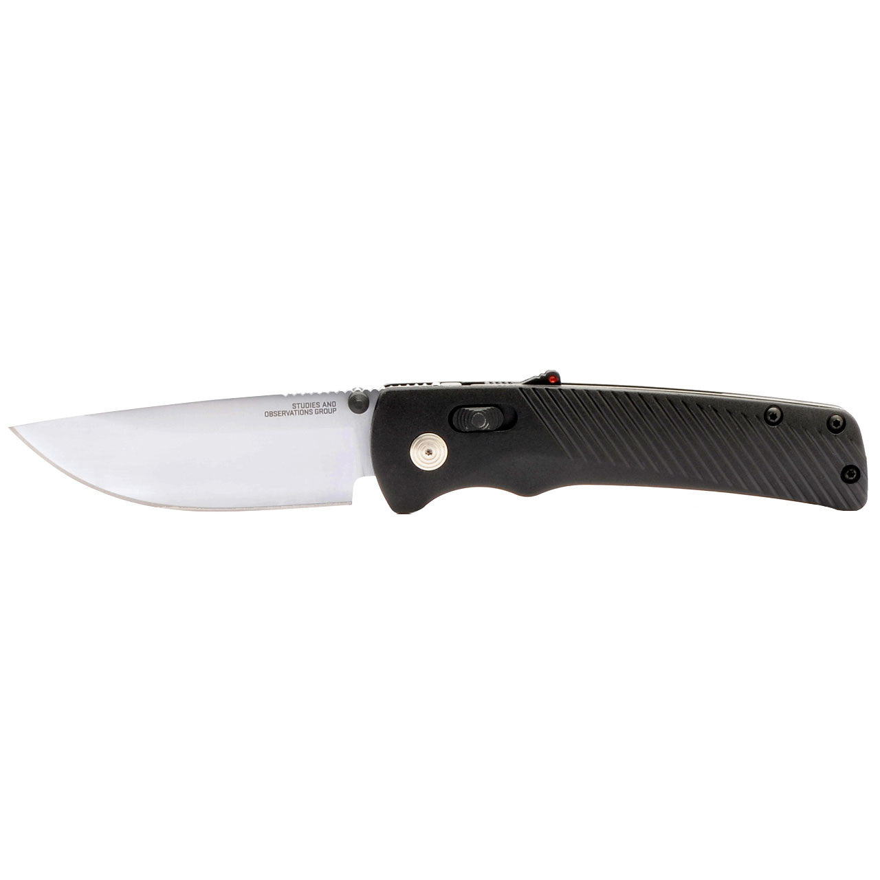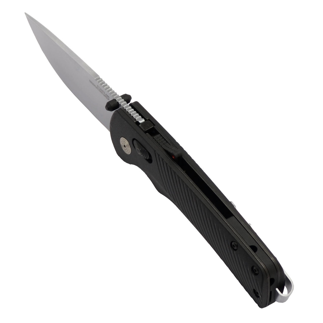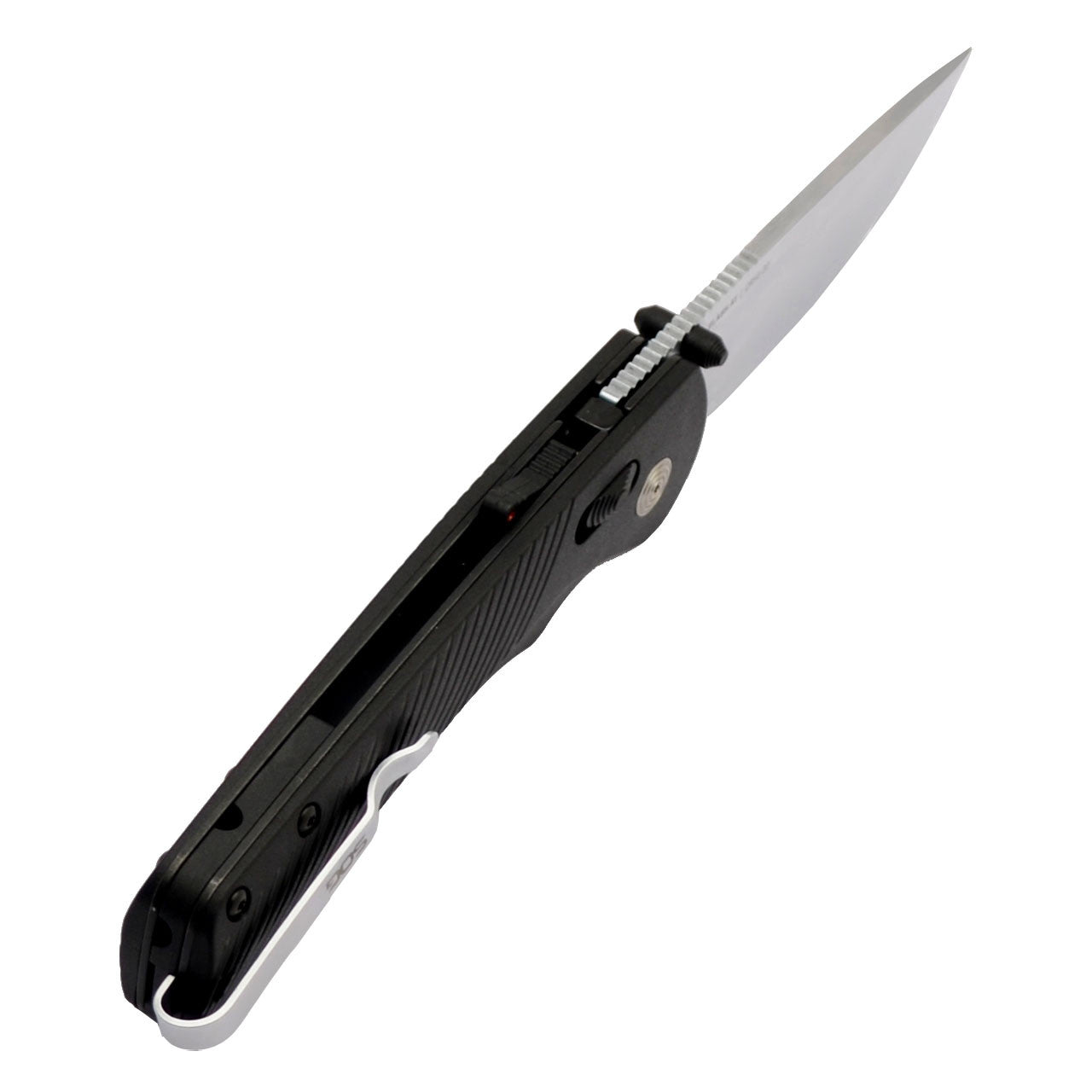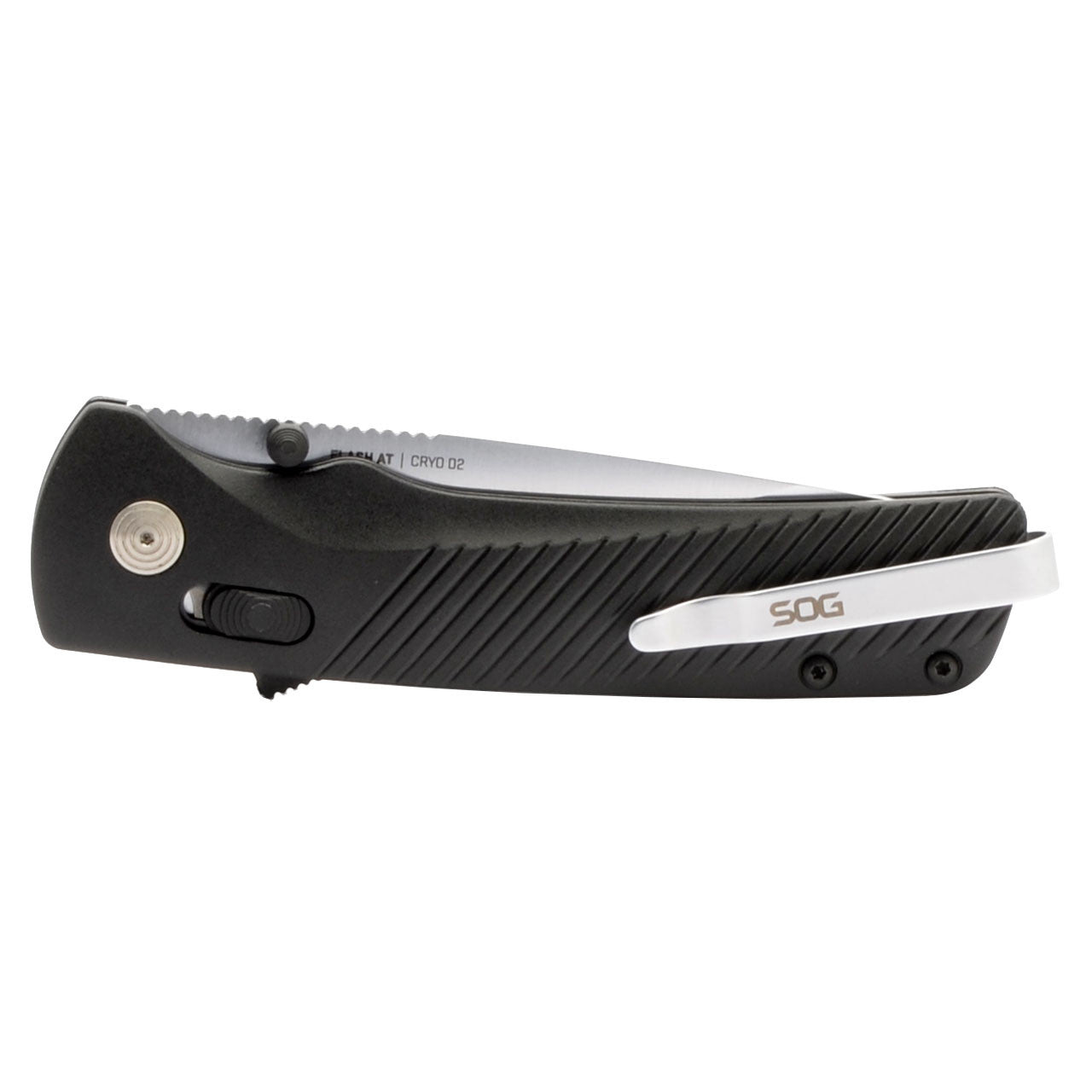 This SOG Specialty Knives Flash AT-XR knife utilizes a 3 3/8" Straight-back blade with a plain edge, 3.1mm (0.12") thickness, spine jimping and thumb studs that are aided by a reflex spring. The blade material is Cryo D2 Semi-Stainless Steel with cryogenic heat-treatment and a Satin finish. The handle is textured Black GRN with blacked out hardware, ambidextrous AT-XR lock, a spine-mount safety, and a reversible tip-up polished pocket clip. It's around 4 5/8 inches long (folded/closed) and weighs approximately 4.5 ounces.