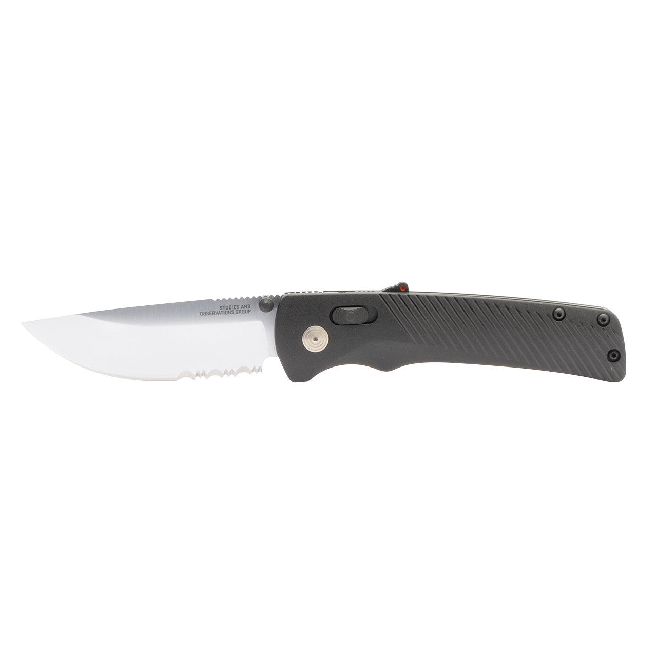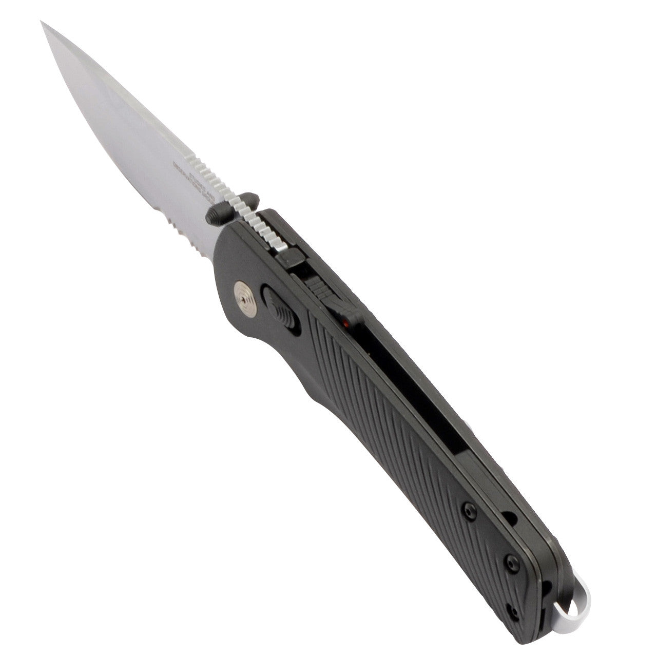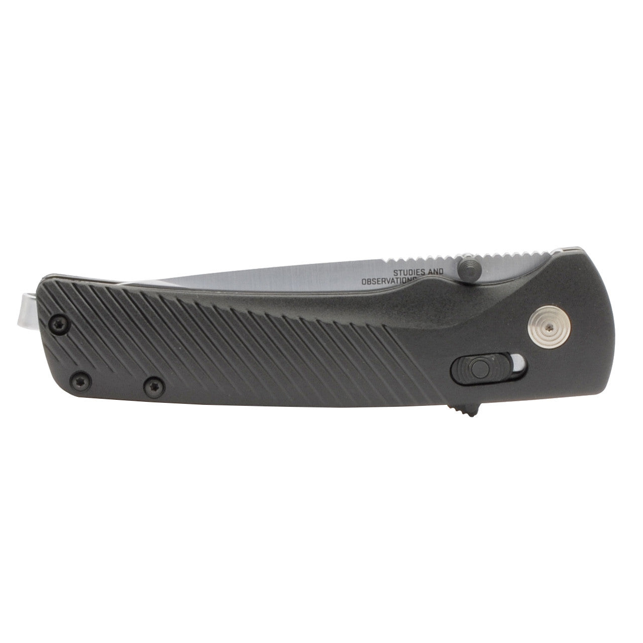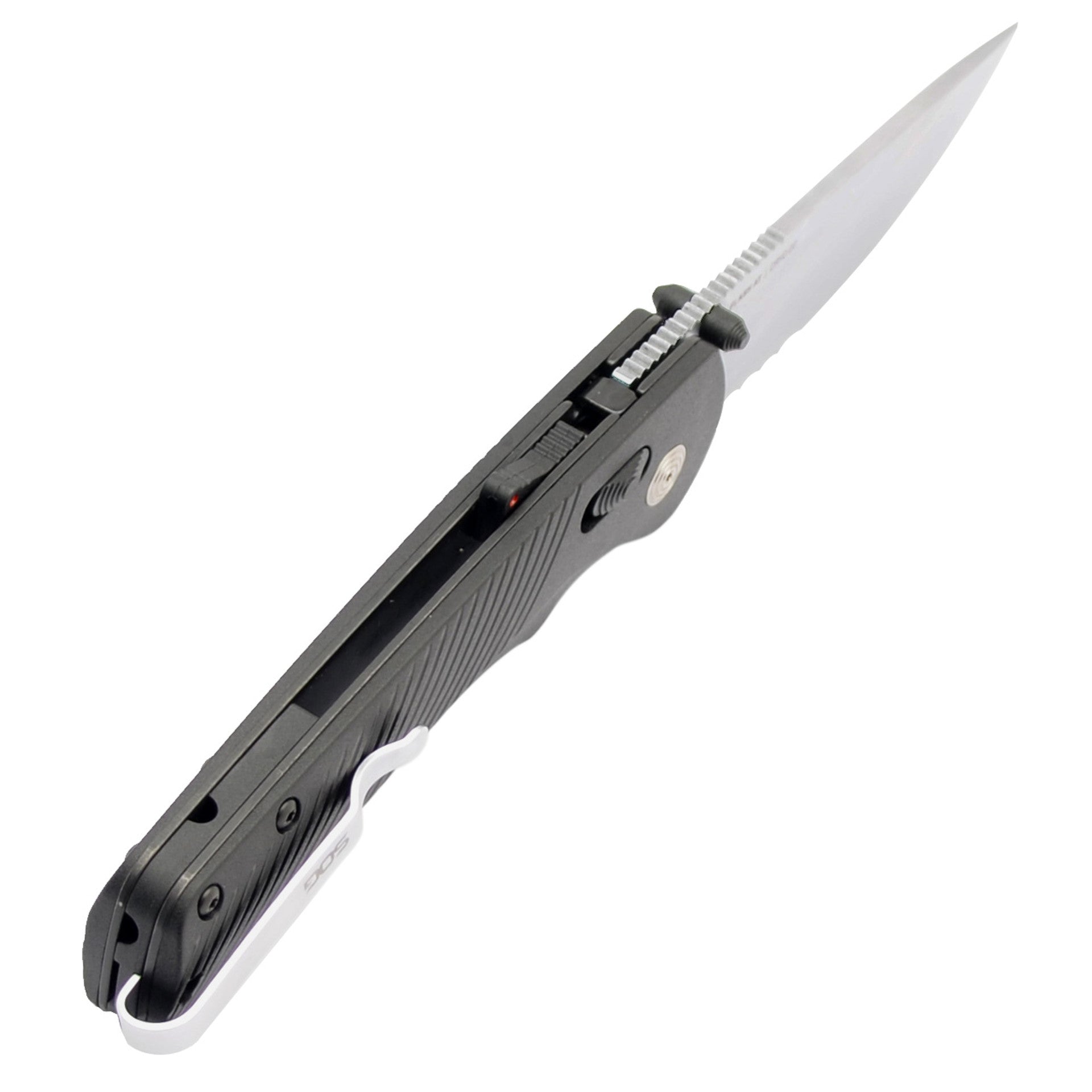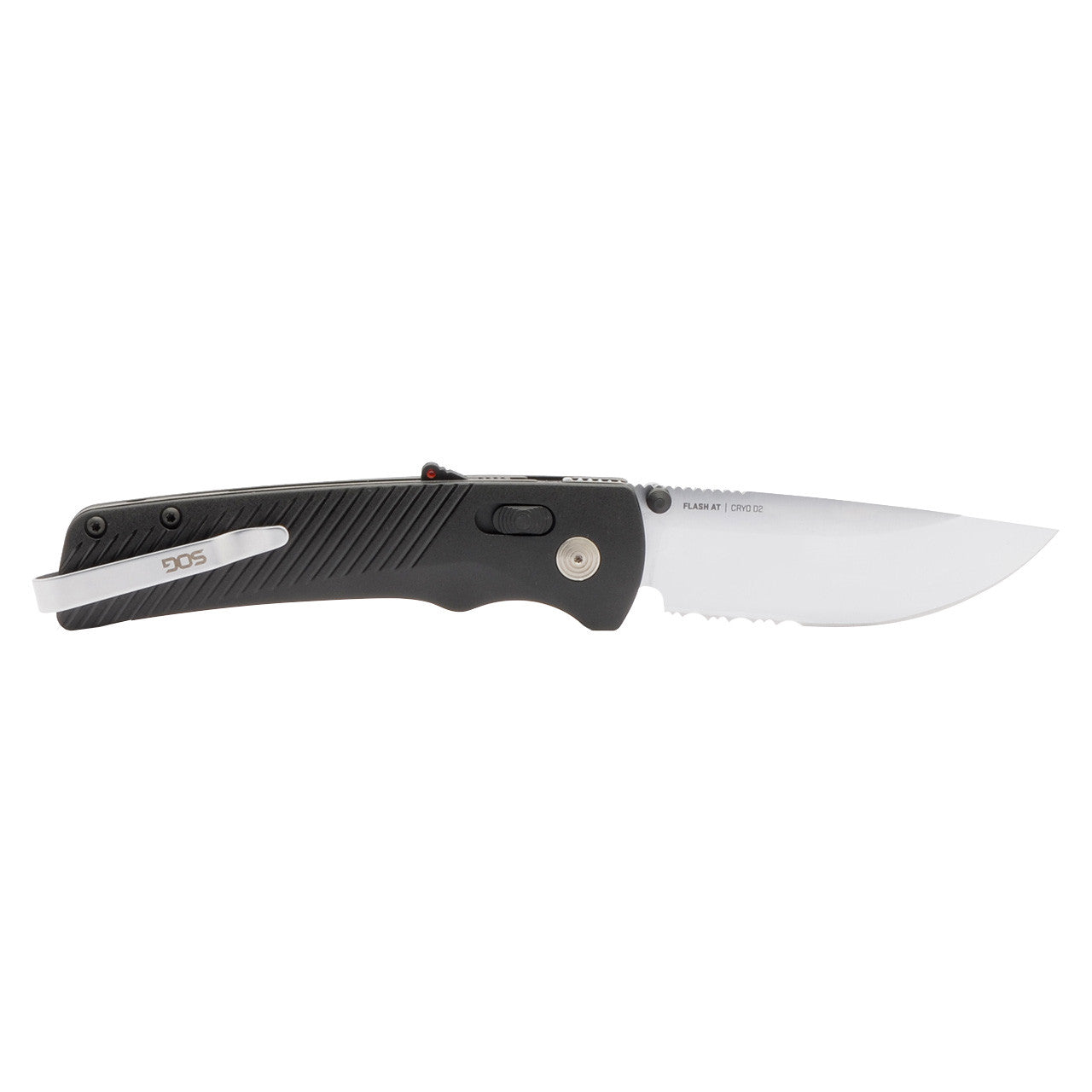 This SOG Specialty Knives Flash AT-XR knife utilizes a 3 3/8" Straight-back blade with a plain edge, 3.1mm (0.12") thickness, spine jimping and thumb studs that are aided by a reflex spring. The blade material is Cryo D2 Semi-Stainless Steel with cryogenic heat-treatment and a Satin finish. The handle is textured Black GRN with black hardware, ambidextrous AT-XR lock, a spine-mount safety, and a reversible tip-up polished pocket clip. It's around 4 7/8 inches long (folded/closed) and weighs approximately 4.5 ounces.