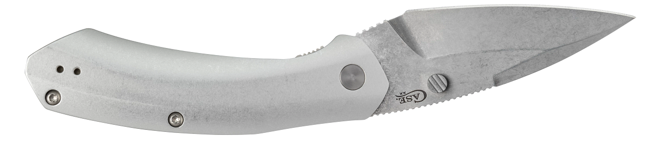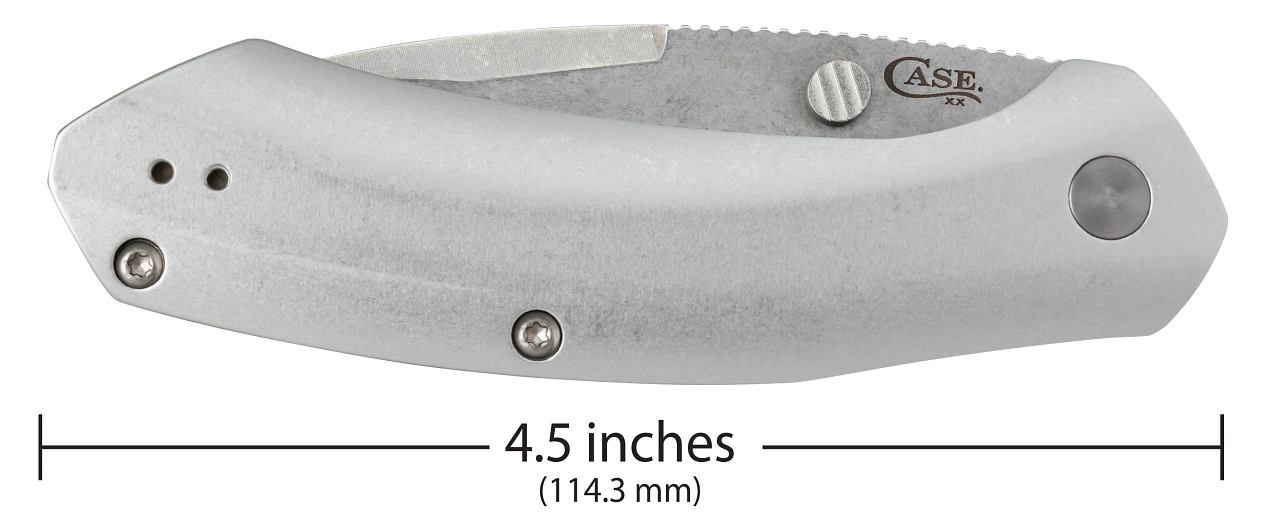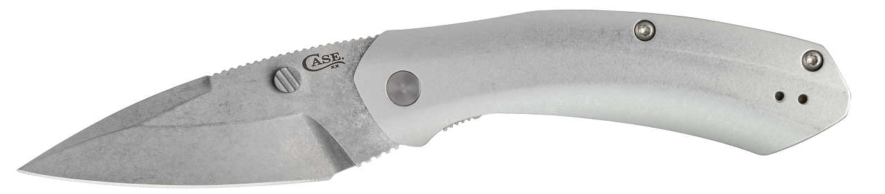 This W.R. Case & Sons Cutlery Co. Westline Liner Lock knife utilizes a 3 1/2" Locking Drop Point blade with a plain edge, 2.5mm thickness, spine jimping and thumb studs that are aided by a reflex spring. Stamped with pattern number WESTLINE S35VN, the blade material is CPM S35VN Stainless Steel with a Stonewashed finish. The handle is polished Aluminum with a reversible tip-up pocket clip/lanyard hole. It's around 4 5/8 inches long (folded/closed) and weighs approximately 4.5 ounces.