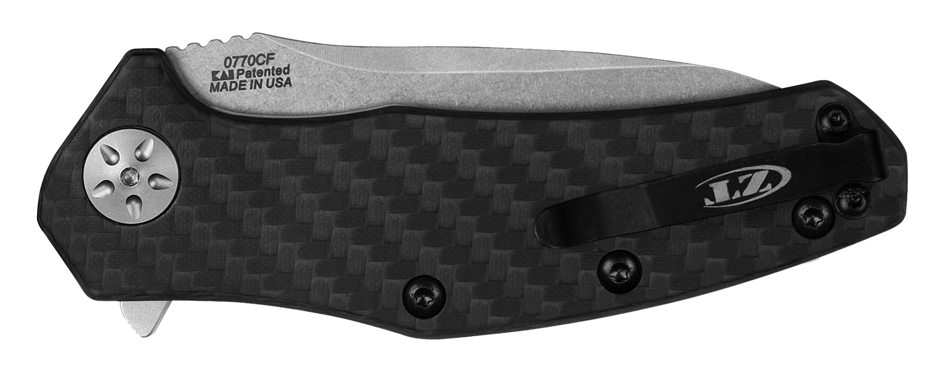 This Zero Tolerance Knives 0770 Liner Lock knife utilizes a 3 3/8" Locking Curved Wharncliffe blade with spine jimping and a finger lever that's aided by a reflex spring. The blade material is CPM-S35VN Stainless Steel with stonewashed finish. The contoured handle is Carbon Fiber with revisible pocket clip. It's around 4 3/8 inches long (folded/closed) and weighs approximately 3.1 ounces.