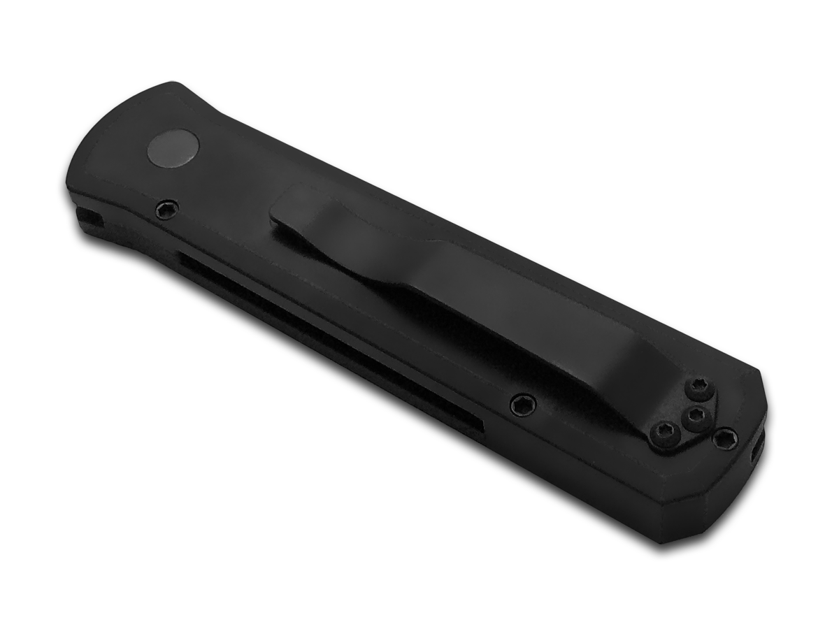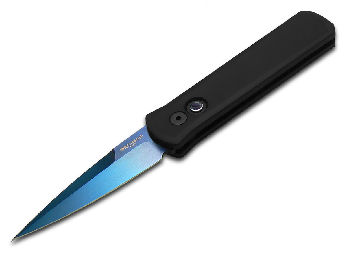 This Pro-Tech Knives, LLC Godson Auto knife utilizes a 3 1/2" Locking Spear Point blade with a plain edge, swedge, and 2.8mm(0.11") thickness. The blade material is 154-CM Stainless Steel with a Sapphire Blue finish. The handle is smooth Black anodized Aluminum with a right-hand Abalone button release and a right-carry tip-up pocket clip. It's around 4 1/2 inches long (folded/closed) and weighs approximately 3.0 ounces. Handcrafted in the U.S.A., this knife comes complete with Limited Lifetime Manufacturer's Warranty, a Storage Pouch and Box. PayPal is restricted for this product.