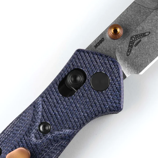 This Benchmade, Inc. Mini Osborne knife utilizes a 3" Locking Reverse Tanto blade with a plain edge, swedge, bronze thumb studs, and 2.6mm (0.10") thickness. The blade material is M390 Stainless Steel (59-61HRC) with a Satin finish. The handle is Blue Denim Micarta with black Axis lock, finger guard, thumb ramp, and reversible tip-up pocket clip. It's around 3 7/8 inches long (folded/closed) and weighs approximately 2.2 ounces.