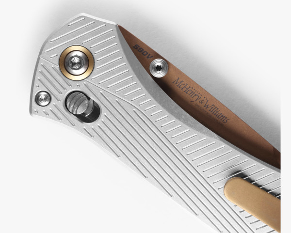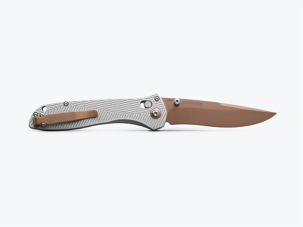 This Benchmade, Inc. Seven-Ten knife utilizes a 4" Locking Recurve Drop Point blade with a plain edge, swedge, 2.9mm (0.114") thickness and thumb studs. The blade material is CPM-S90V Stainless Steel with Flat Dark Earth PVD coating. The handle is textured Gray 6061-T6 Aluminum with an ambidextrous Axis Lock, lanyard hole, and reversible tip-up pocket clip. It's around 5 inches long (folded/closed) and weighs approximately 4.9 ounces.