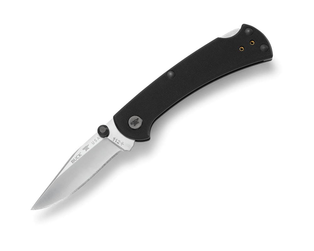 This Buck Knives 112 Slim Pro TRX Lockback knife utilizes a 3" Locking Clip Point blade with a plain edge, swedge, 3mm thickness and thumb studs. The blade material is S30V Stainless Steel with a Satin finish. The handle is Black G10 with a reversible tip-up pocket clip/lanyard hole. It's...