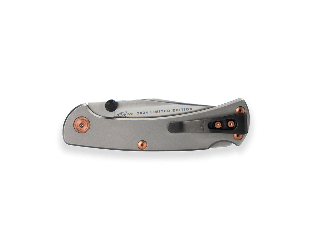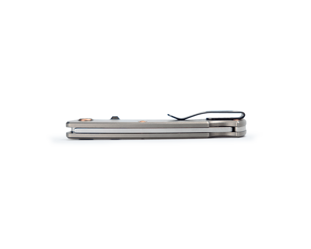 This Buck Knives Ranger Slim Legacy Lockback knife utilizes a 3" Locking Clip Point blade with a plain edge, swedge, 3mm thickness, and thumb studs. The blade material is S45VN Stainless Steel with a Satin finish. The handle is Bead-blasted Titanium with bronze hardware and black reversible, tip-up pocket clip/lanyard...