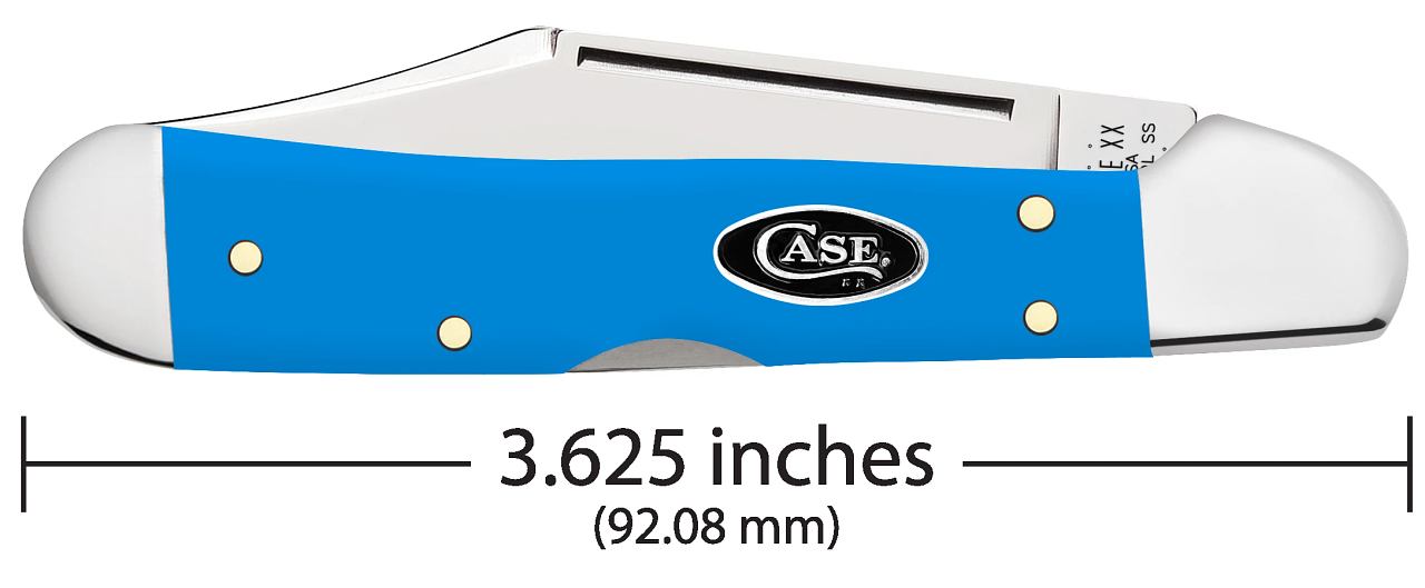This W.R. Case & Sons Cutlery Co. Mini Copperlock knife utilizes a 2 3/4" Locking Clip blade. Stamped with pattern number 41749L SS, the blade material is Tru-Sharp Surgical Stainless Steel with a mirror-polished finish. The handle is smooth Light Blue Synthetic with a Black Oval Script Inlay shield. The bolsters are Highly polished Nickel Silver. It's around 3 5/8 inches long (folded/closed) and weighs approximately 2.0 ounces.