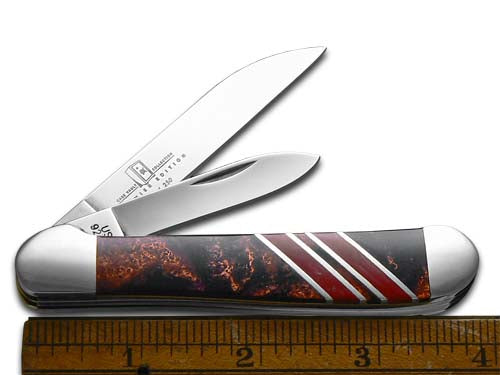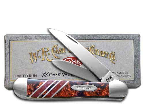 One of only 250 made! This W.R. Case & Sons Cutlery Co. Copperhead knife utilizes a 3" Wharncliffe blade and 2 1/8" Spear blade. Stamped with pattern number 9249W SS, the blade material is Tru-sharp Surgical Stainless Steel with a mirror-polished finish and with 'Case Vault Collection, Premium Edition, 1 of 250' on the back side of the main blade. The handle is Maroon Pearl Corelon and Sundance Corelon Inlays on both sides and a Nickel Silver Bombshell Roman Numeral shield. The bolsters are Highly polished Nickel Silver. It's around 4 inches long (folded/closed) and weighs approximately 3.1 ounces.