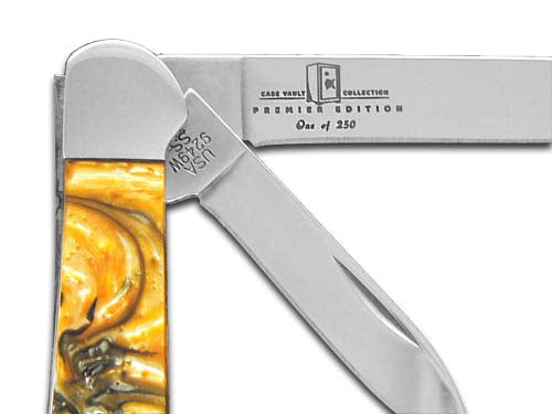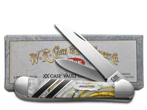 One of only 250 made! This W.R. Case & Sons Cutlery Co. Copperhead knife utilizes a 3" Wharncliffe blade and 2 1/8" Spear blade. Stamped with pattern number 9249W SS, the blade material is Tru-sharp Surgical Stainless Steel with a mirror-polished finish and with 'Case Vault Collection, Premium Edition, 1 of 250' on the back side of the main blade. The handle is White Buffalo Corelon and America's Black Coal Corelon Inlays on both sides and a Nickel Silver Bombshell Roman Numeral shield. The bolsters are Highly polished Nickel Silver. It's around 4 inches long (folded/closed) and weighs approximately 3.1 ounces.