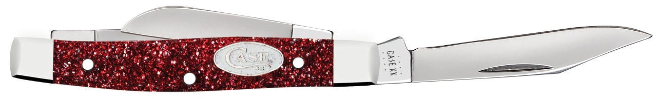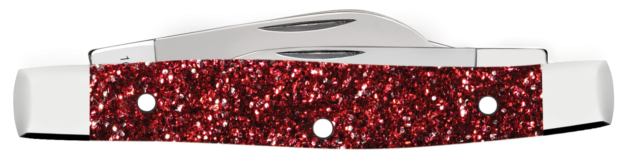 This W.R. Case & Sons Cutlery Co. Small Stockman knife utilizes a 2 " Clip blade, 1 1/2" Sheepfoot Coping blade and 1 1/2" Pen blade. Stamped with pattern number 10333 SS, the blade material is Tru-Sharp Surgical Stainless Steel with Mirror-polished finish. The handle is Red Ruby Stardust Kirinite with an Oval White Sparxx Inlay shield. The bolsters are highly polished Nickel Silver. It's around 2 5/8 inches long (folded/closed) and weighs approximately 0.9 ounces.