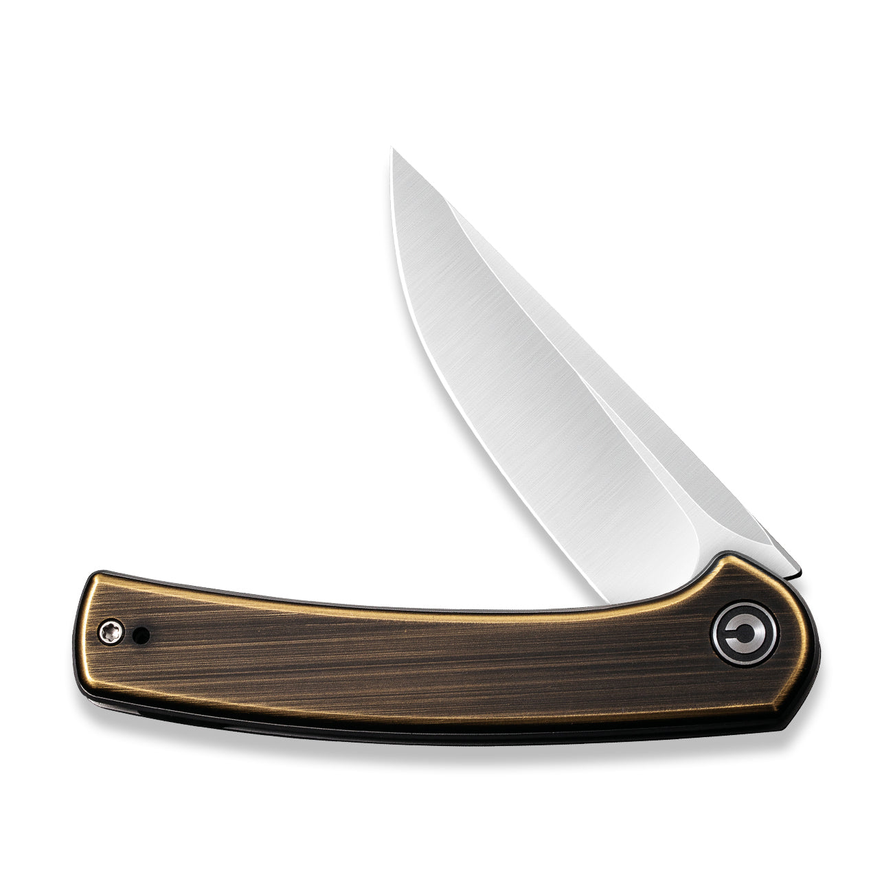 This CIVIVI Knives Mini Asticus Liner Lock knife utilizes a 3 1/4" Locking Skinner blade with a hollow grind and finger lever. The blade material is 10Cr15CoMoV Stainless Steel with a satin finish. The handle is Black Hand-Rubbed Brass with a reversible tip-up pocket clip. It's around 4 3/8 inches long (folded/closed) and weighs approximately 5.1 ounces. Handcrafted in China, this knife comes complete with Limited Lifetime Manufacturer's Warranty, Storage Pouch and Box.