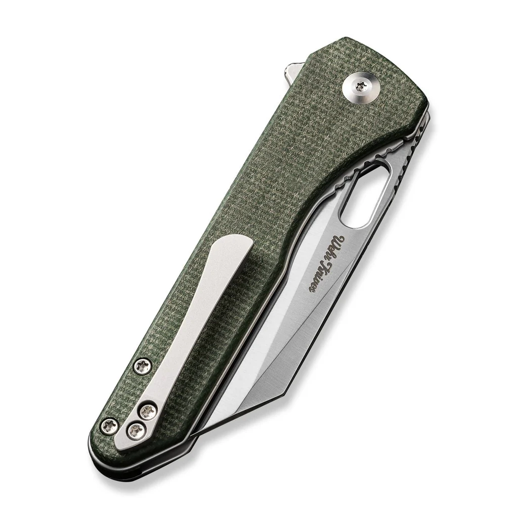 This CIVIVI Knives Nugz Liner Lock knife utilizes a 3 1/8" Locking Reverse Tanto blade with a flat grind, 3mm (0.12") thickness, swedge, thumb hole and finger lever. The blade material is 14C28N Stainless Steel (58-60HRC) with a Satin finish. The handle is textured Green Canvas Micarta with a right-carry tip-up pocket clip. It's around 4 3/8 inches long (folded/closed) and weighs approximately 3.4 ounces. Handcrafted in China, this knife comes complete with Limited Lifetime Manufacturer's Warranty, a Storage Pouch.