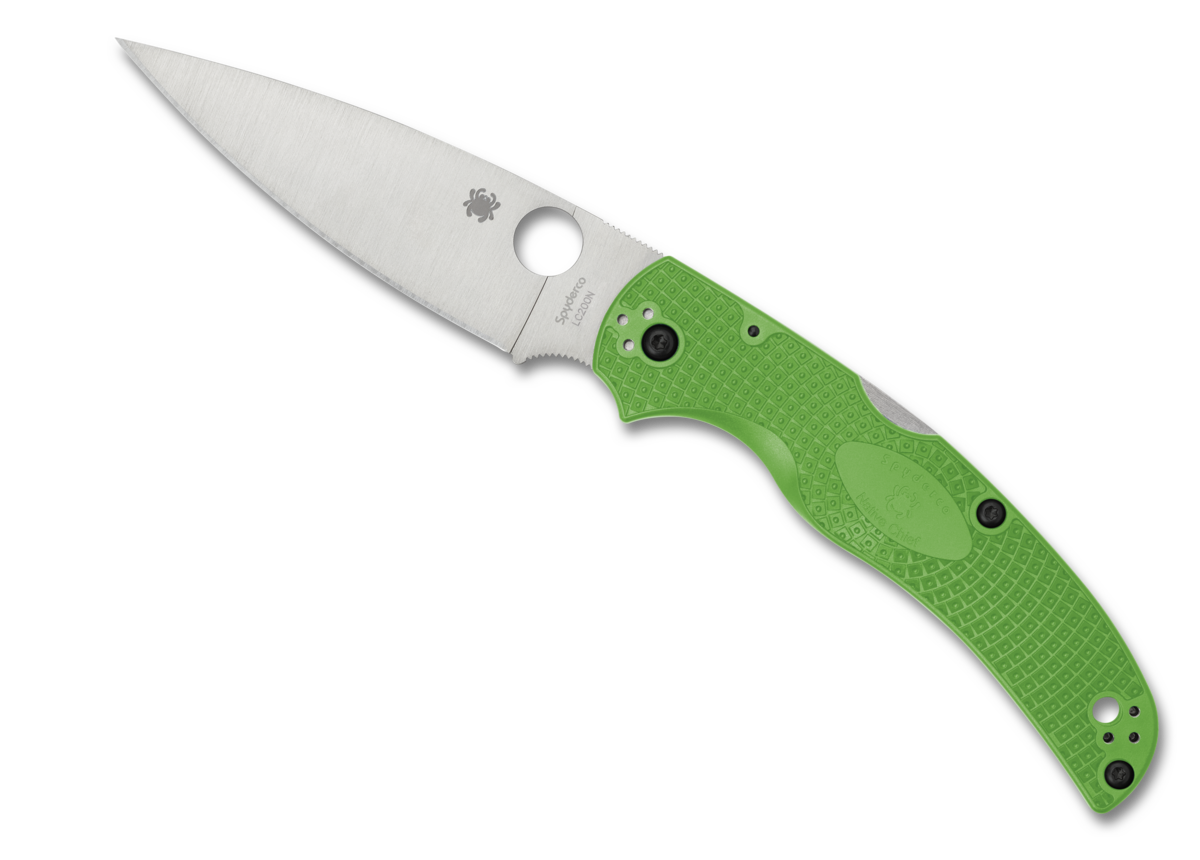 This Spyderco Knives Native Chief Lockback knife utilizes a 4 " Locking Drop Point blade with a Full-flat grind, plain edge, 3.2mm (0.13") thickness, thumb hole, finger choil/guard, and spine jimping. The blade material is LC200N Stainless Steel with a Satin finish. The contoured handle is textured Green FRN with an ambidextrous four-position pocket clip and a lanyard hole. It's around 5 1/8 inches long (folded/closed) and weighs approximately 3.1 ounces....