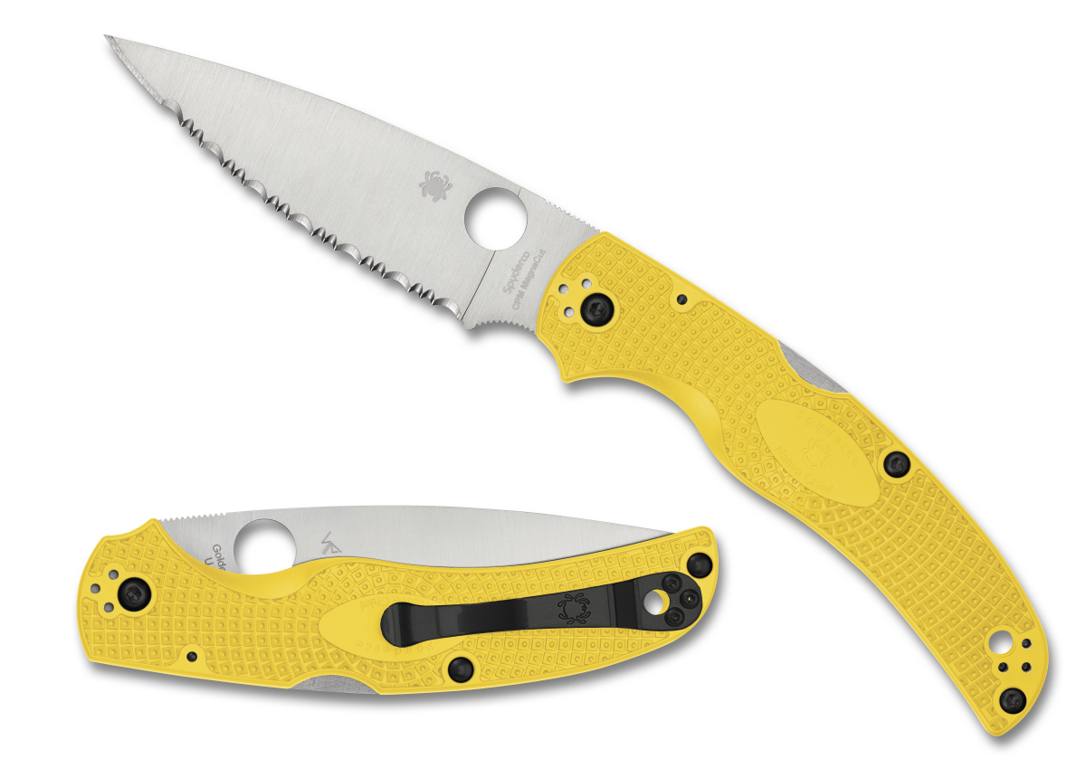 This Spyderco Knives Native Chief Lockback knife utilizes a 4 " Locking Drop Point blade with a Full-flat grind, serrated SpyderEdge, 3.2mm (0.13") thickness, thumb hole, finger choil/guard, and spine jimping. The blade material is CPM MagnaCut Stainless Steel with a Satin finish. The contoured handle is textured Yellow FRN with an ambidextrous four-position pocket clip and a lanyard hole. It's around 5 1/8 inches long (folded/closed) and weighs approximately 3.1 ounces....