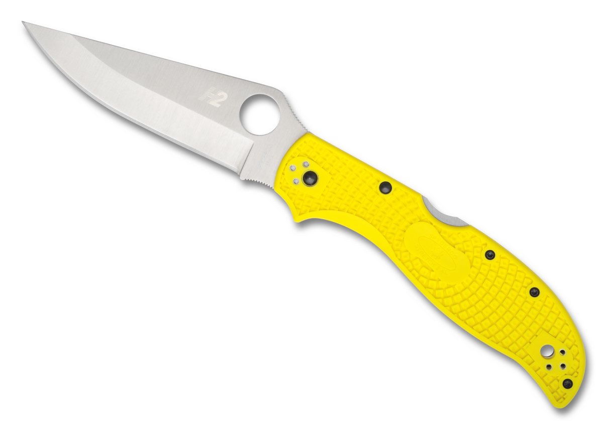 This Spyderco Knives Stretch 2 Xl Lockback knife utilizes a 4 " Locking Straight Back blade with a hollow grind, plain edge, 3mm (0.12") thickness, thumb hole, finger choil/guard, thumb ramp, and spine jimping. The blade material is H-2 Stainless Steel with a Satin finish. The contoured handle is textured Yellow FRN with a Back lock, an ambidextrous four-position pocket clip, and Lanyard hole. It's around 5 inches long (folded/closed) and weighs approximately 2.7 ounces.
