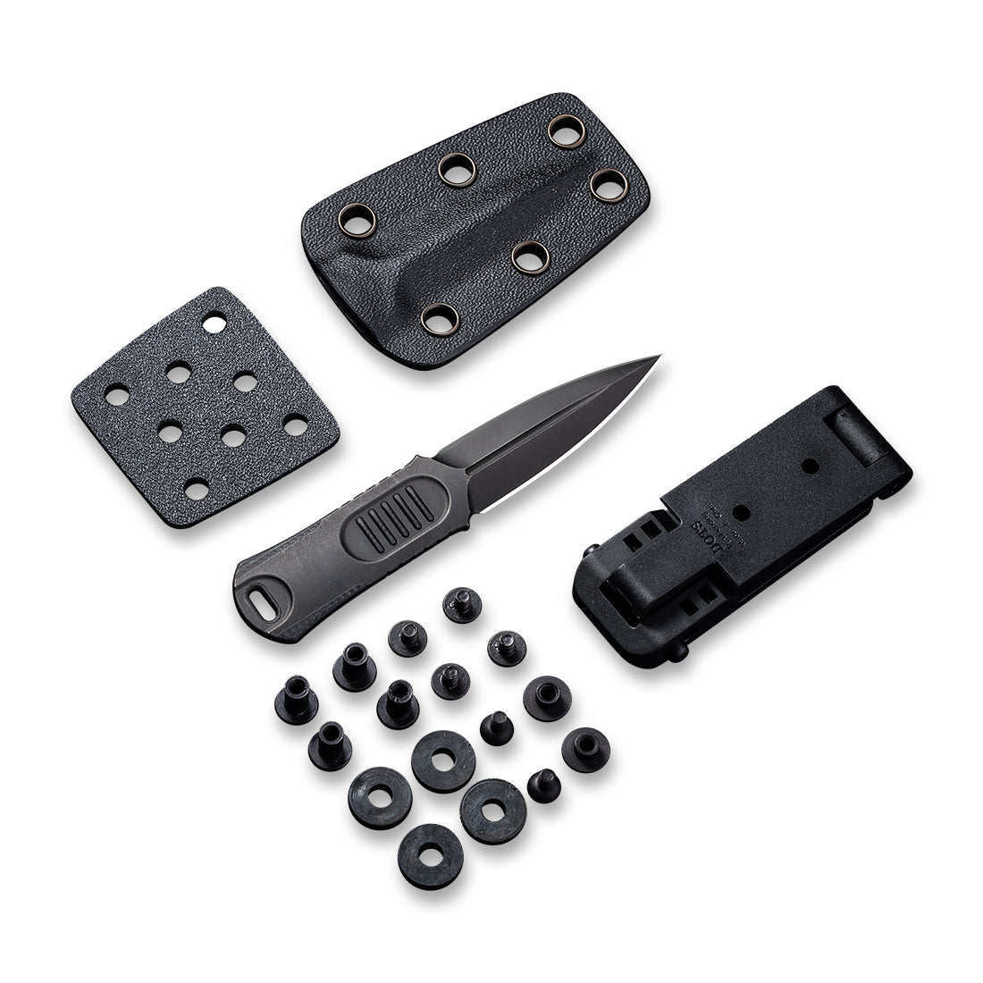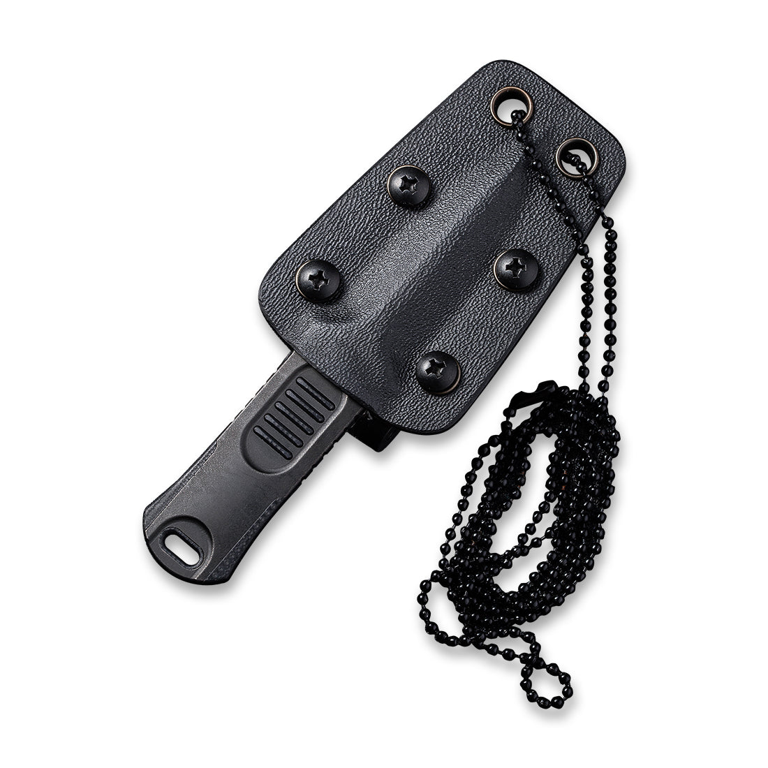 This WE Knife Co., Ltd OSS Fixed Blade Neck Knife knife utilizes a 2 1/4" Double-edged Dagger blade with a chisel grind and 3.2mm thickness. The blade material is CPM 20CV Stainless Steel with Black Stonewash finish. The handle is CPM 20CV Stainless Steel with Black Stonewashed finish, G10 Inlay and lanyard hole. It's around 4 1/4 inches long (total) and weighs approximately 0.7 ounces. Handcrafted in China, this knife comes complete with Limited Lifetime Manufacturer's Warranty, Kydex MOLLE Lok Sheath and Ball Chain.
