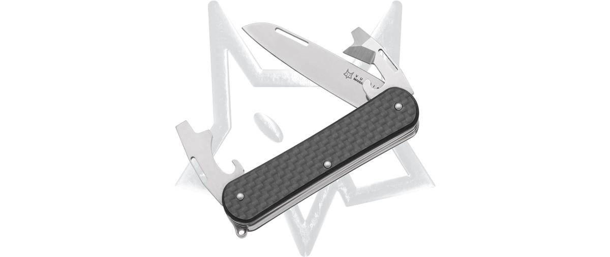 This Fox Knives Vulpis Camp Knife knife utilizes a 2 1/8" Sheepsfoot blade, 1 3/4" Can Opener/Small Screwdriver, and 1 3/4" Bottle Opener/Large Screwdriver. The blade material is M390 Stainless Steel with a highly Polished finish. The handle is smooth Carbon Fiber with a key chain hoop. It's around 3...
