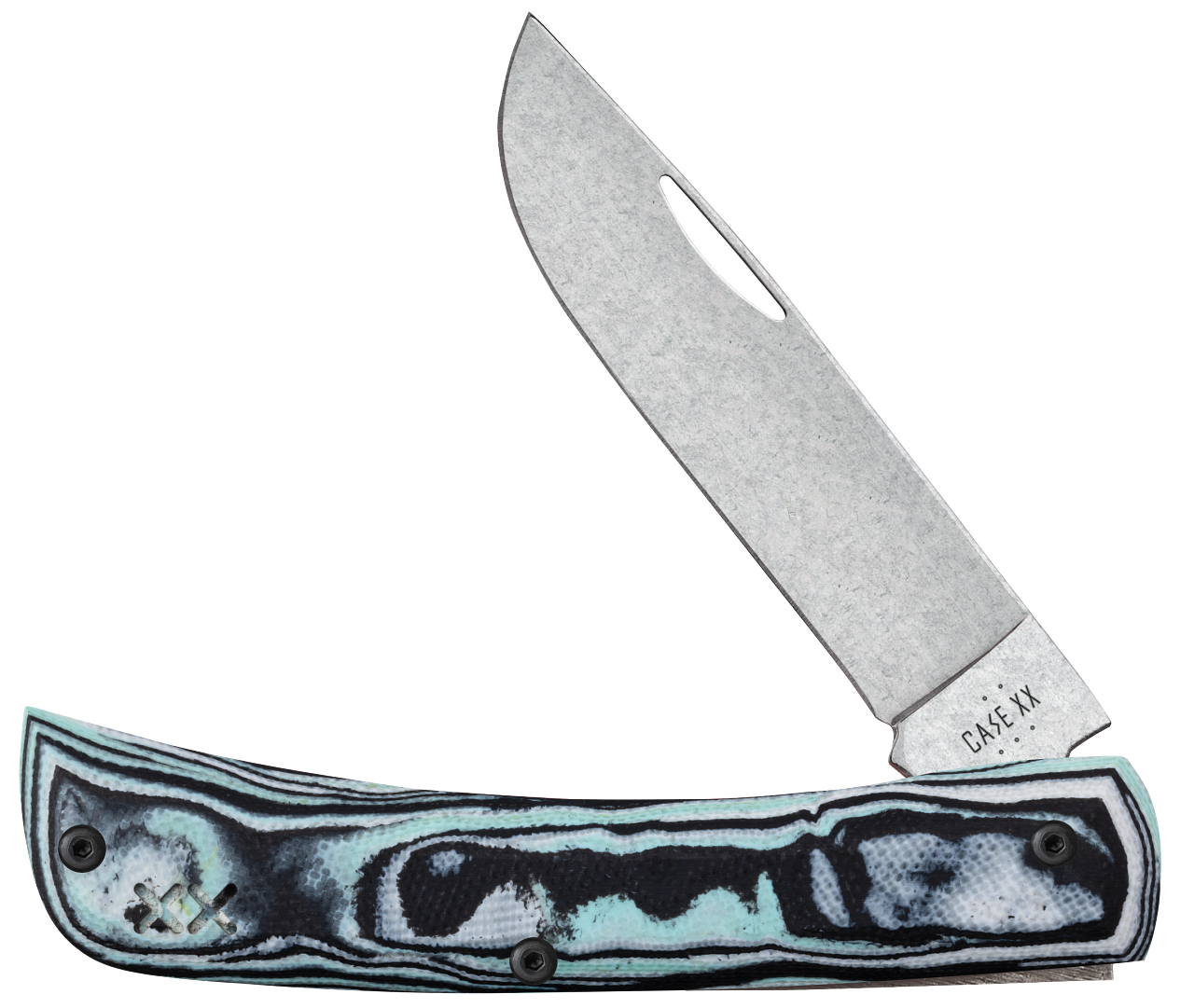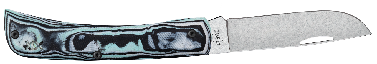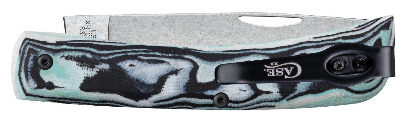This W.R. Case & Sons Cutlery Co. Sod Buster Jr knife utilizes a 2 7/8" Skinner blade with an open nail nick. Stamped with pattern number XR10137C S35VN, the blade material is CPM S35VN Stainless Steel with a Stonewashed finish. The handle is Seafoam Green Burl G-10 with pocket clip. It's around 3 3/4 inches long (folded/closed) and weighs approximately 1.9 ounces.