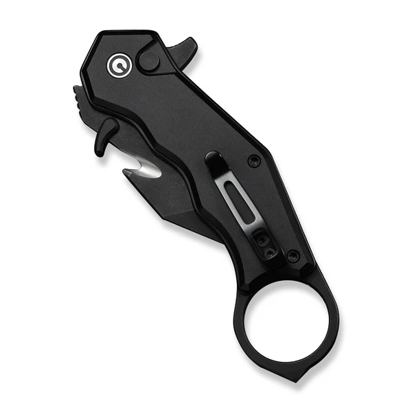 This CIVIVI Knives Amaroq Button Lock Karambit knife utilizes a 2 1/8" Locking Reverse Tanto blade with a flat grind, 3mm (0.12") thickness, gut hook, pocket hook, and finger lever. The blade material is Nitro-V Stainless Steel (58-60HRC) with a Black Stonewashed finish. The contured handle is Black Anodized Aluminum with a reversible tip-up pocket clip and finger hoop/glass breaker. It's around 4 5/8 inches long (folded/closed) and weighs approximately 4.0 ounces. Handcrafted in China, this knife comes complete with Limited Lifetime Manufacturer's Warranty, a Storage Pouch.
