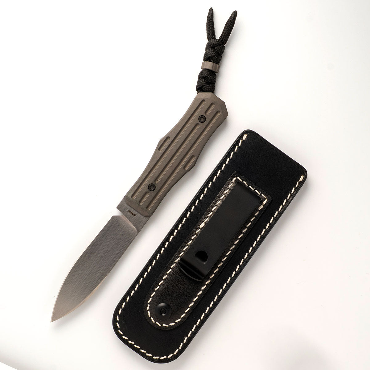 This Jack Wolf Knives Vampire FIXedc knife utilizes a 3" Drop Point fixed blade with a hollow grind and 3mm (0.12") thickness. The blade material is S90V Stainless Steel (60-61HRC) with a Hand Satin finish. The coffin-shaped handle is fluted Dark Blast Titanium with Torx harware and lanyard hole. It's around 6 inches long (folded/closed) and weighs approximately 1.6 ounces. Handcrafted in China, this knife comes complete with Limited Lifetime Manufacturer's Warranty, a Snake-Knot Paracord Lanyard, Black Leather Belt Sheath and VHS-style Presentation Box.