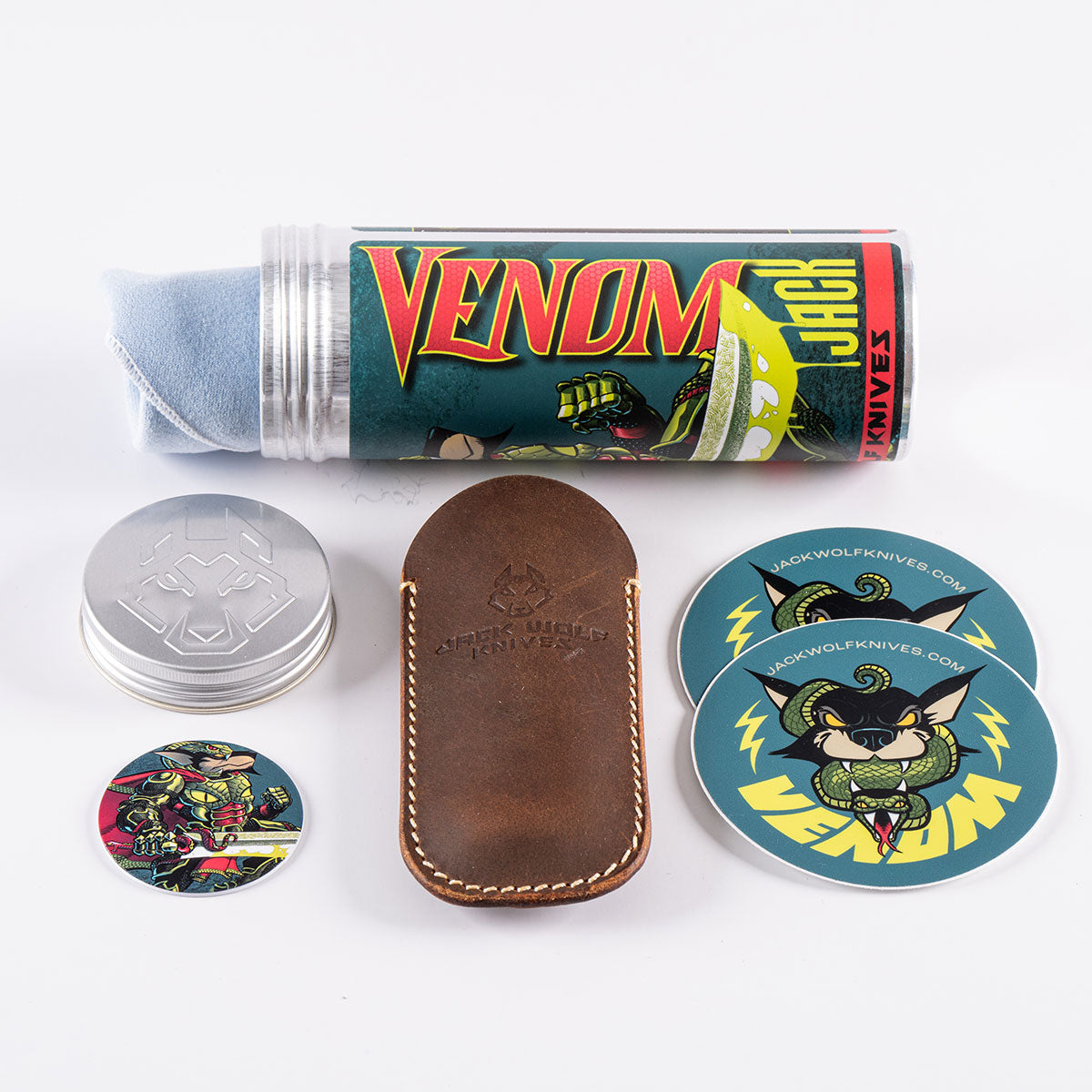 This Jack Wolf Knives Venom Jack Trapper knife utilizes a 3" Locking Wharncliffe blade with a hollow grind, 3mm (0.12") thickness and nail nick. The blade material is S90V Stainless Steel (60-61HRC) with a Satin finish. The handle is Blue Marble Fat Carbon Fiber with Dark Blasted 6AL4V Titanium bolsters/liners and hardware. The intergral bolsters are Dark Blasted Titanium. It's around 3 7/8 inches long (folded/closed) and weighs approximately 2.5 ounces. Handcrafted in China, this knife comes complete with Limited Lifetime Manufacturer's Warranty, Storage Pouch and Collector's Tin.