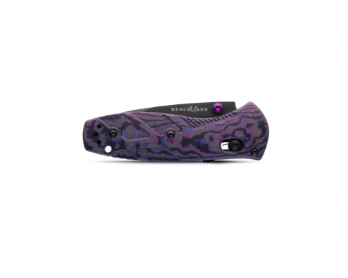 One of only 3500 made! This Benchmade, Inc. Mini Barrage knife utilizes a 3" Locking Drop-point blade with a plain edge, swedge, 2.5mm thickness, and Abyss Purple thumb studs aided by a reflex spring. The blade material is CPM-S90V Stainless Steel (58-60HRC) with a Black Battlewash DLC finish. The handle is textured, Purple Haze Fatcarbon Fiber with black Axis lock, lanyard hole, Abyss PVD-coated hardware and reversible tip-up pocket clip. It's around 4 inches long (folded/closed) and weighs approximately 3.4 ounces.