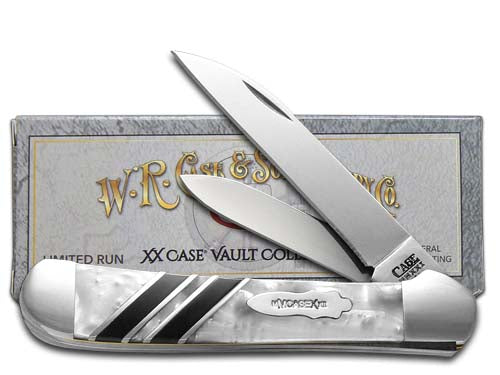 One of only 250 made! This W.R. Case & Sons Cutlery Co. Copperhead knife utilizes a 3" Wharncliffe blade and 2 1/8" Spear blade. Stamped with pattern number 9249W SS, the blade material is Tru-sharp Surgical Stainless Steel with a mirror-polished finish and with 'Case Vault Collection, Premium Edition, 1 of 250' on the back side of the main blade. The handle is White Pearl Corelon and Black Pearl Corelon Inlays with a Nickel Silver Bombshell Roman Numeral shield. The bolsters are Highly polished Nickel Silver. It's around 4 inches long (folded/closed) and weighs approximately 3.1 ounces.