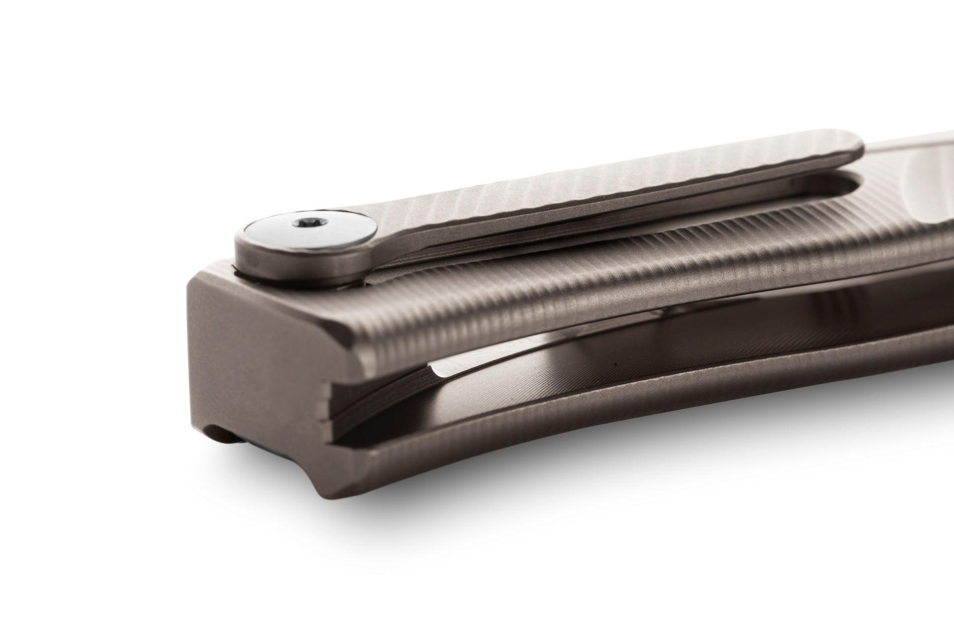 This LionSteel Knives Thrill Slip-joint knife utilizes a 3 1/8" Drop Point blade with a plain edge and 3.3mm thickness. The blade material is M390 Stainless Steel with a satin finish. The handle is textured Bronze 6AI4V Titanium with a retractable, tip-up pocket clip. The frame is a single solid piece of titanium rather than 2 halves joined by screws, so the handle is one single, strong element of the knife. It's around 4 inches long (folded/closed) and weighs approximately 2.5 ounces.