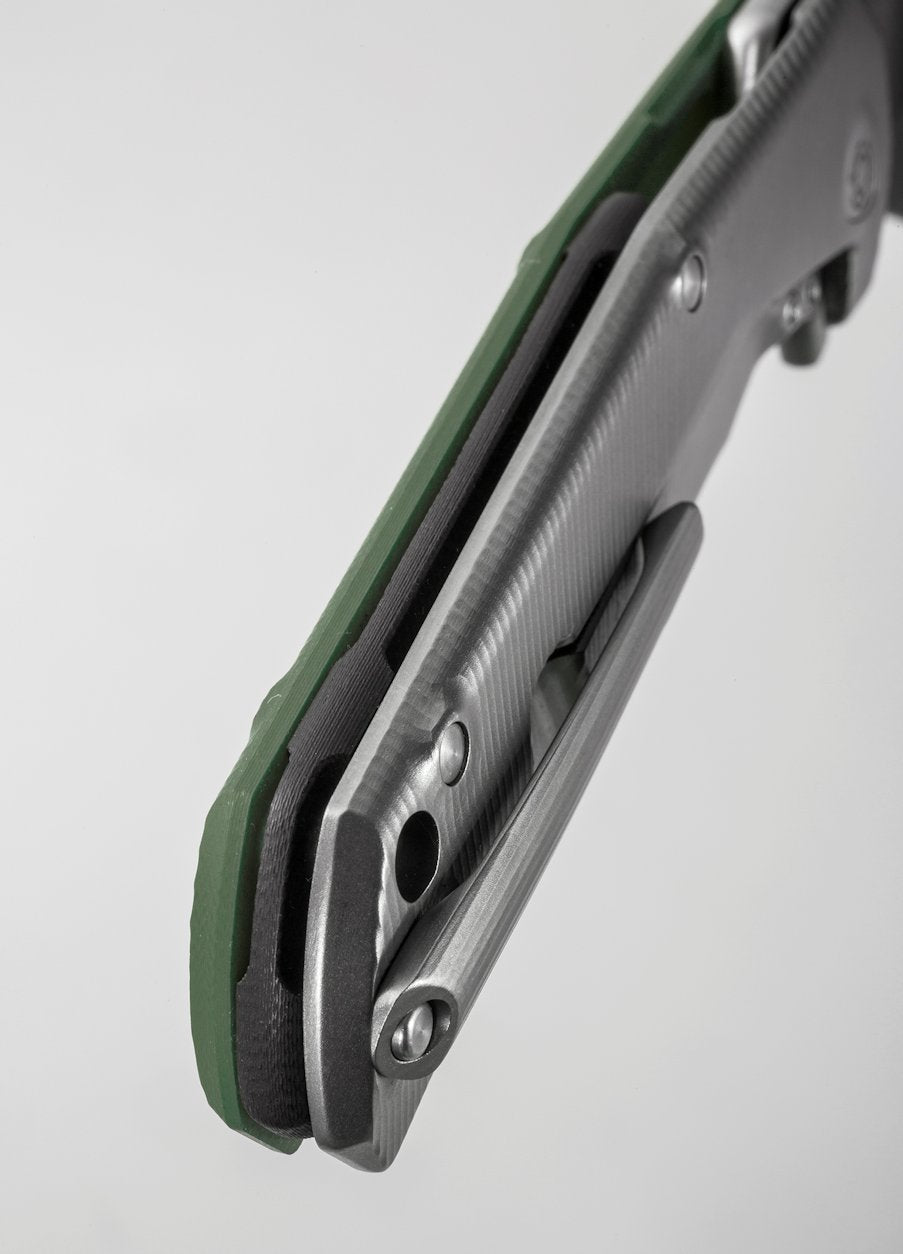 This LionSteel Knives TRE Frame Lock knife utilizes a 3" Locking Drop Point blade with a plain edge, 3.5mm thickness, and finger lever. The blade material is M390 Stainless Steel with a Stonewashed finish. The handle is contoured and textured Green G10 and 6AI4V Titanium with a lanyard hole and Titanium reversible tip-up pocket clip. It's around 4 inches long (folded/closed) and weighs approximately 2.4 ounces.
