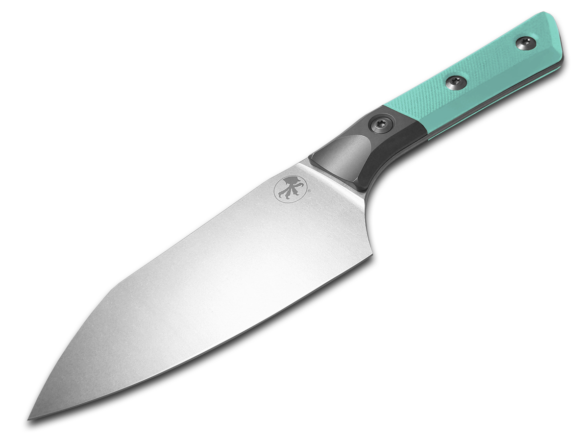 This Microtech Knives, LLC Large Santoku Kitchen Knife knife utilizes a 6" Sheepsfoot blade with a 2mm (0.08") spine thickness. The blade material is Bohler M390MK Stainless Steel with Stonewashed finish. The contoured handle is textured Caribbean Blue G10 with polished Torx screws. It's around 11 1/2 inches long (total) and weighs approximately 9.1 ounces. Handcrafted in the U.S.A., this knife comes complete with Limited Lifetime Manufacturer's Warranty, a Felt Blade Protector, Polishing Cloth, Knife Care Instructions, and Padded Box.