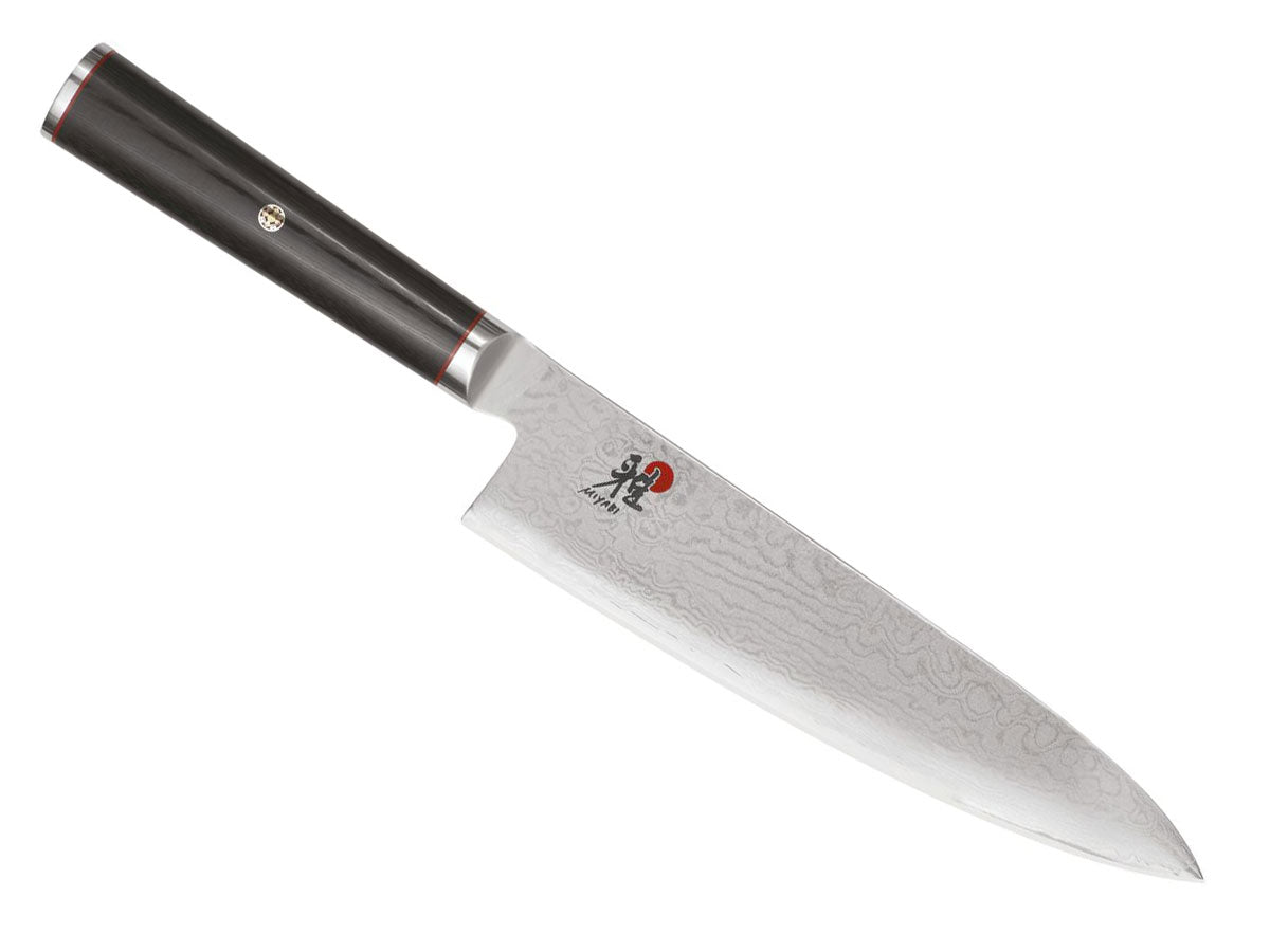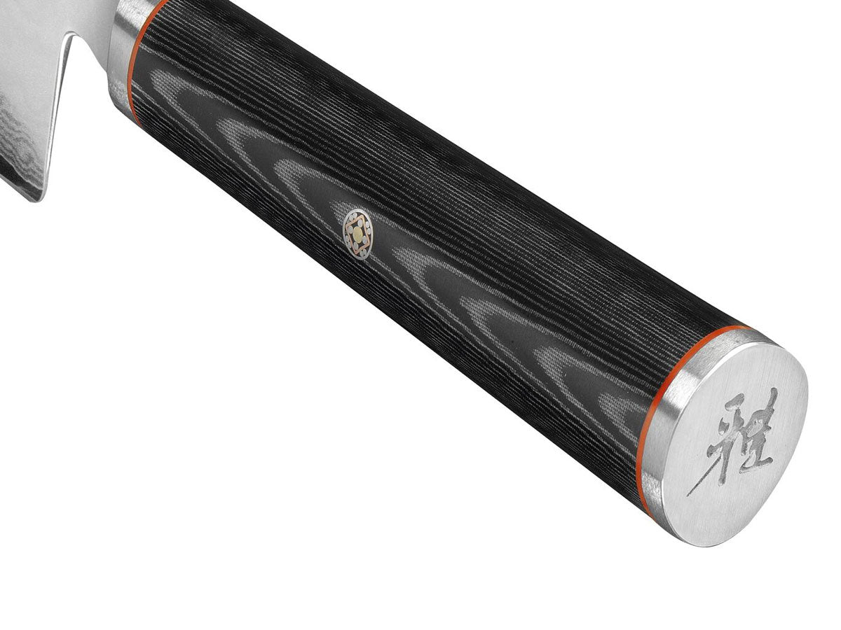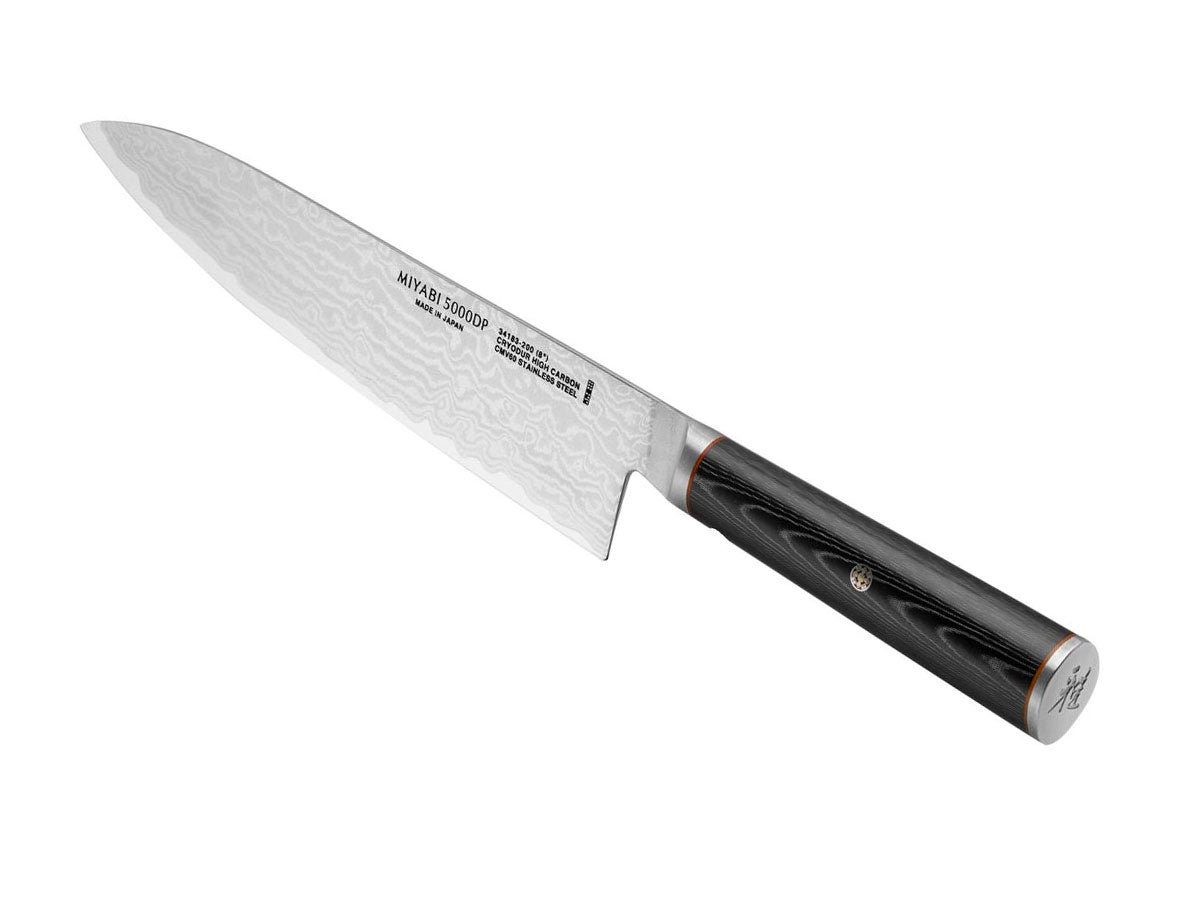 This Miyabi Knives Gyutoh Chef's Knife knife utilizes a 8" Chef's blade with authentic thin Japanese profile and a three-step Honbazuke 9.5-12 degree Katana edge. The blade material is 64-layer Damascus Steel with 'Flower' pattern, a VG10 core and ice-hardened CRYODUR treatment. The handle is Black Linen Micarta with intricate Mosaic Pin and Miyabi engraved pommel. It's around 13 inches long (total) and weighs approximately 7.0 ounces.