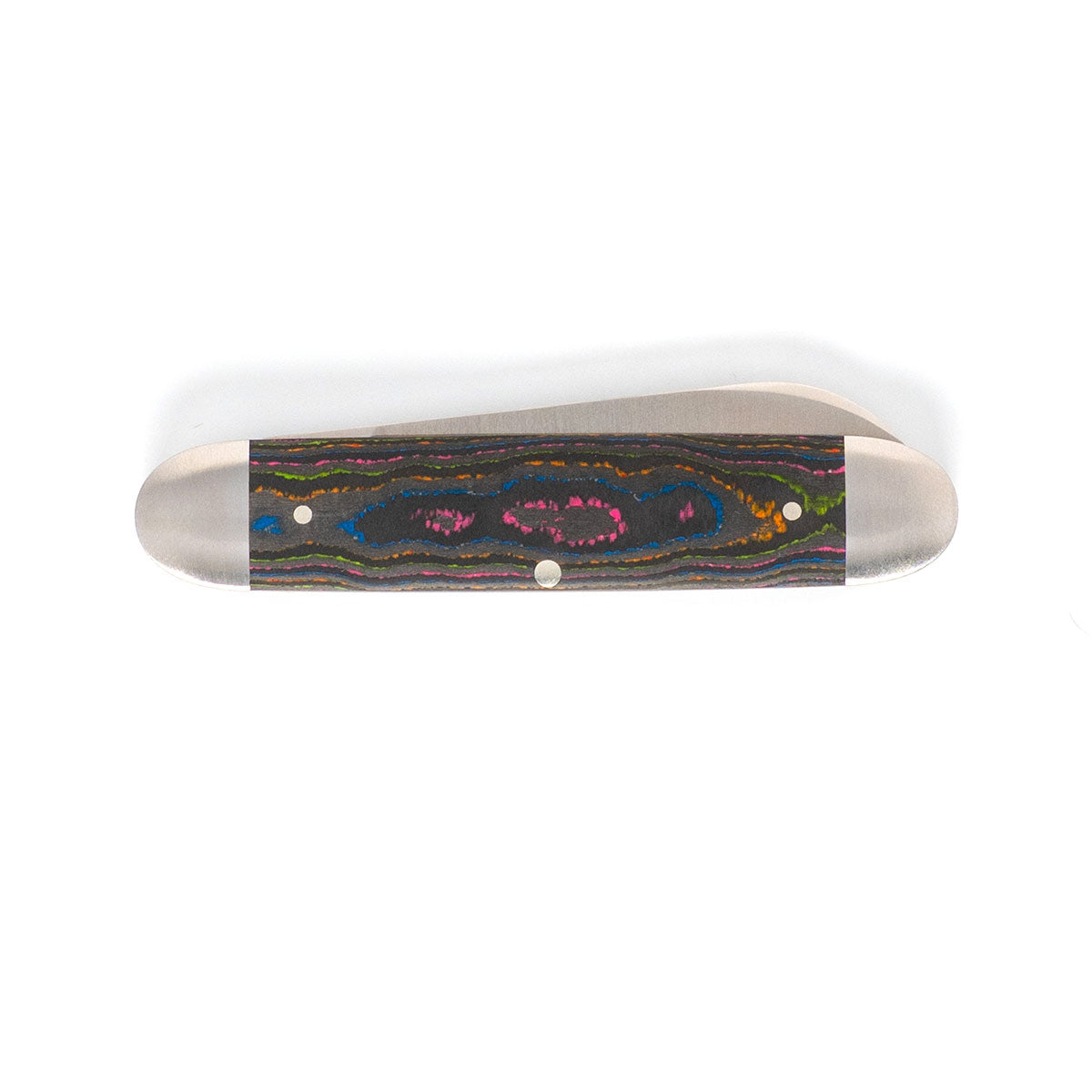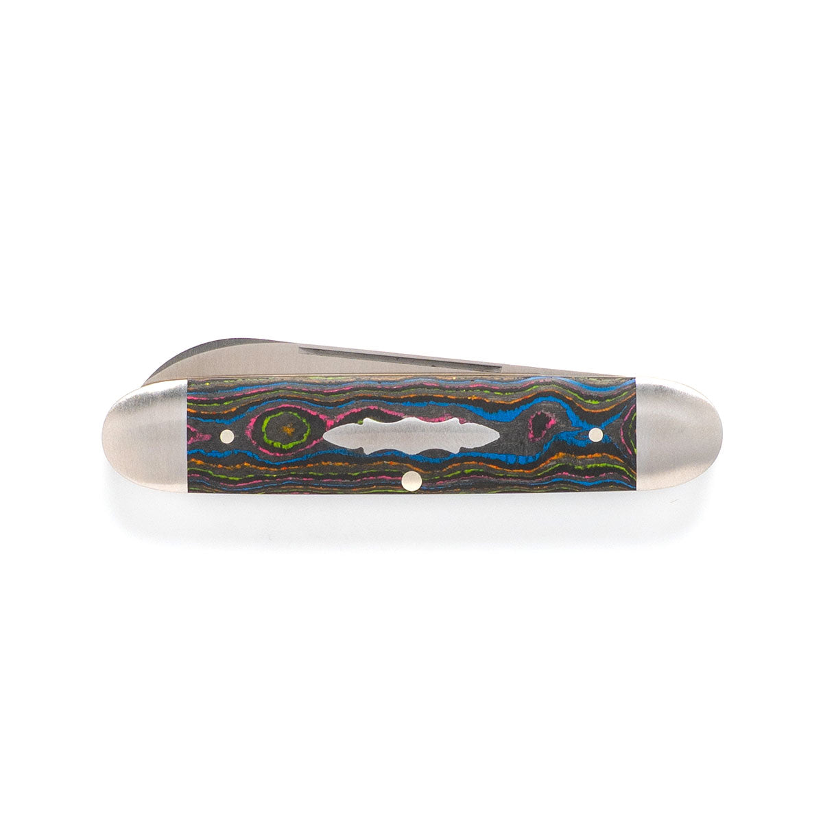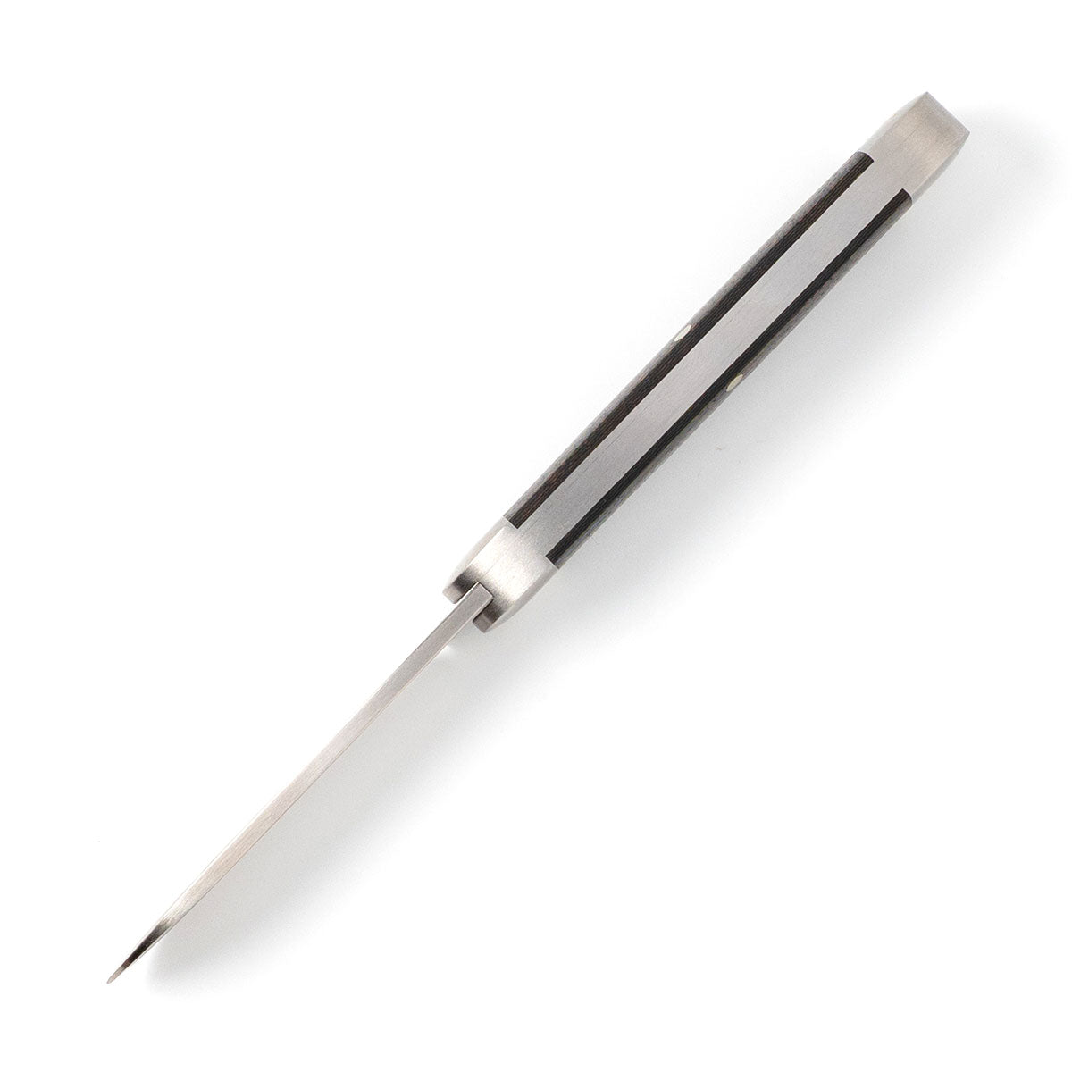 This Jack Wolf Knives Gateway Equal End knife utilizes a 2 3/4" 'Big Belly' Spear Point blade with a flat grind, 2.5mm (0.10") thickness and nail nick. The blade material is Sandvik 14C28N Stainless Steel (58-59HRC) with a Belt Satin finish. The handle is smooth 80s CamoCarbon with integral Stainless Steel bolsters/liners and Banner shield. The bolsters are Satin Stainless Steel. It's around 3 3/4 inches long (folded/closed) and weighs approximately 2.7 ounces.