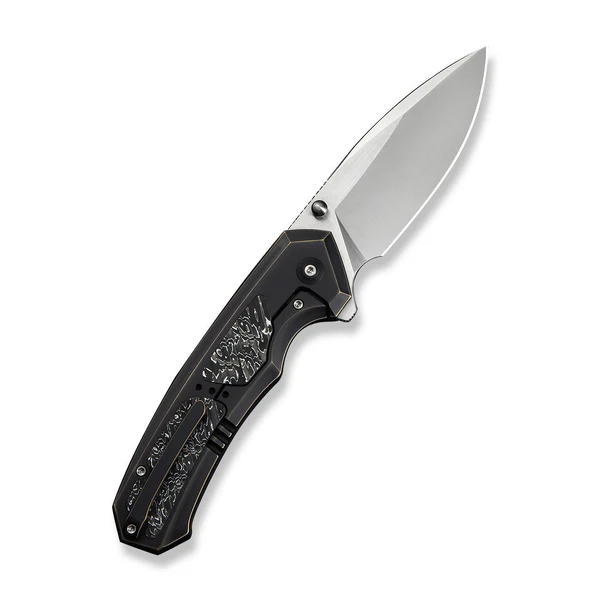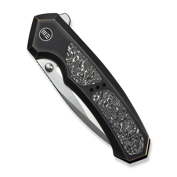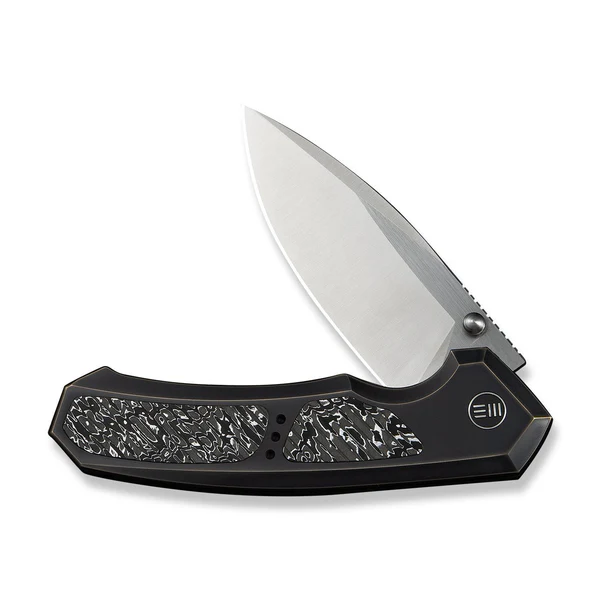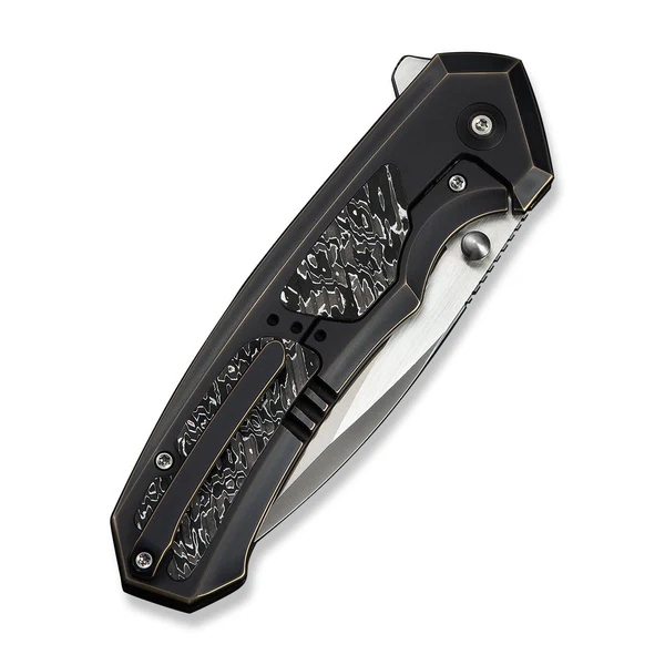 This WE Knife Co., Ltd Corwyn Frame Lock knife utilizes a 3 3/4" Locking Drop Point blade with a flat grind, 3.2mm (0.13") thickness, swedge, spine jimping, finger choil, thumb studs and finger lever. The blade material is M390 Stainless Steel (59-61HRC) with a Belt Satin finish. The handle is Black & Bronze Anodized 6AL4V Titanium and Aluminum Carbon Fiber Inlays with a right-carry tip-up Titanium pocket clip and finger groove. It's around 5 1/4 inches long (folded/closed) and weighs approximately 5.3 ounces. Handcrafted in China, this knife comes complete with Limited Lifetime Manufacturer's Warranty, Storage Pouch and Box.
