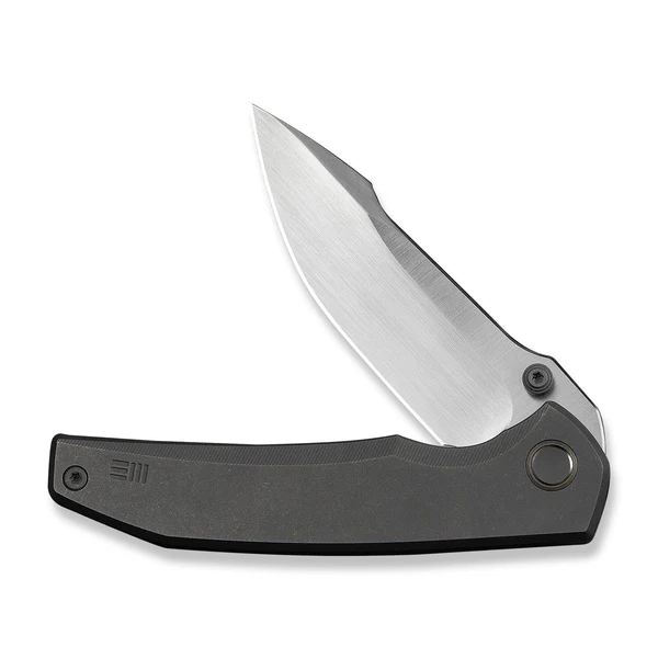 This WE Knife Co., Ltd Ryson Frame Lock knife utilizes a 3 3/8" Locking "Harpoon" Drop Point blade with a hollow grind, 3.2mm (0.13") thickness, swedge, forward thumb ramp, and thumb studs. The blade material is M390 Stainless Steel (59-61HRC) with a hand-rubbed Satin finish. The handle is Dark Gray Anodized 6AL4V Titanium with a finger groove/guard and right-carry tip-up Titanium pocket clip. It's around 4 3/8 inches long (folded/closed) and weighs approximately 3.1 ounces. Handcrafted in China, this knife comes complete with Limited Lifetime Manufacturer's Warranty, Storage Pouch and Box.