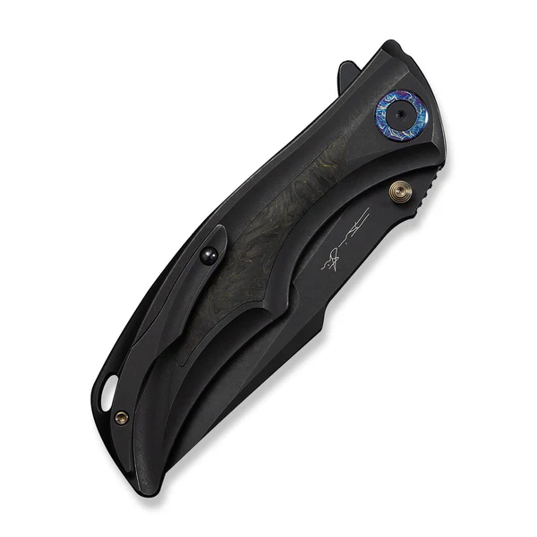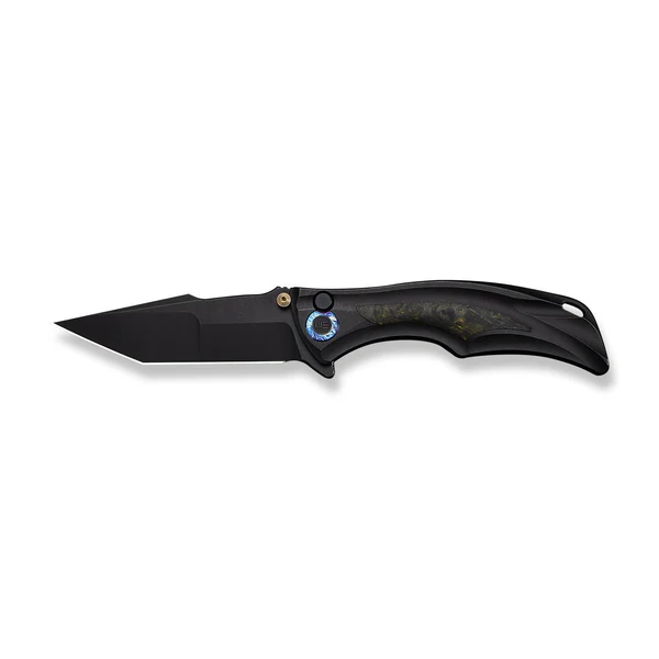 This WE Knife Co., Ltd Tighe Down Button Lock knife utilizes a 4" Locking Tanto blade with a flat grind, 4mm (0.16") thickness, swedge, thumb groove, thumb studs, and finger lever. The blade material is M390 Stainless Steel (59-61HRC) with a Black Stonewashed finish. The integral handle is contoured Black Anodized 6AL4V Titanium with Yellow & Black Marbled Carbon Fiber Inlays, Flamed Pivot Collar, reversible tip-up roller-ball Titanium pocket clip, and lanyard hole. It's around 5 1/8 inches long (folded/closed) and weighs approximately 6.0 ounces. Handcrafted in China, this knife comes complete with Limited Lifetime Manufacturer's Warranty, Storage Pouch and Box.