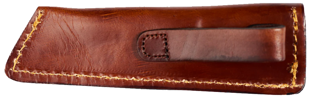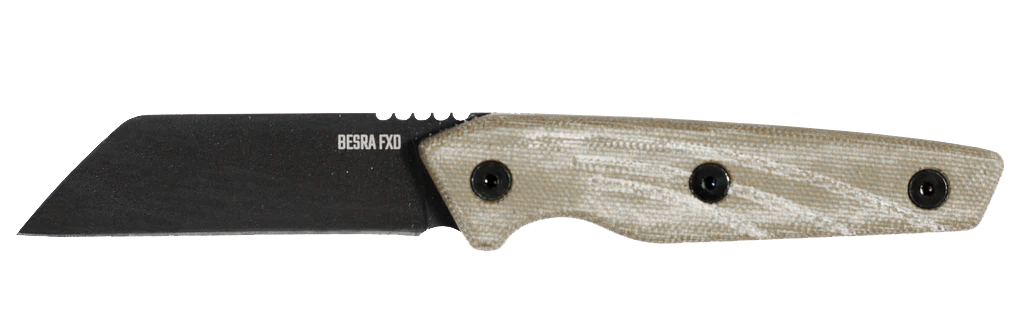 This Ontario Knives Besra Fixed Blade knife utilizes a 3 1/2" Sheepsfoot blade with a plain edge, 3mm thickness and spine jimping. The blade material is 1075 Carbon Steel with Blackened finish.Note: Carbon Steel is generally harder than stainless steel, this allows the blade to hold a sharper edge, longer. However, Carbon Steel will corrode/rust if it's not cleaned and oiled regularly. The handle is Tan Canvas Micarta. It's around 8 inches long (total) and weighs approximately 4.8 ounces. Handcrafted in the U.S.A., this knife comes complete with Limited Lifetime Manufacturer's Warranty, a Leather Belt Sheath.