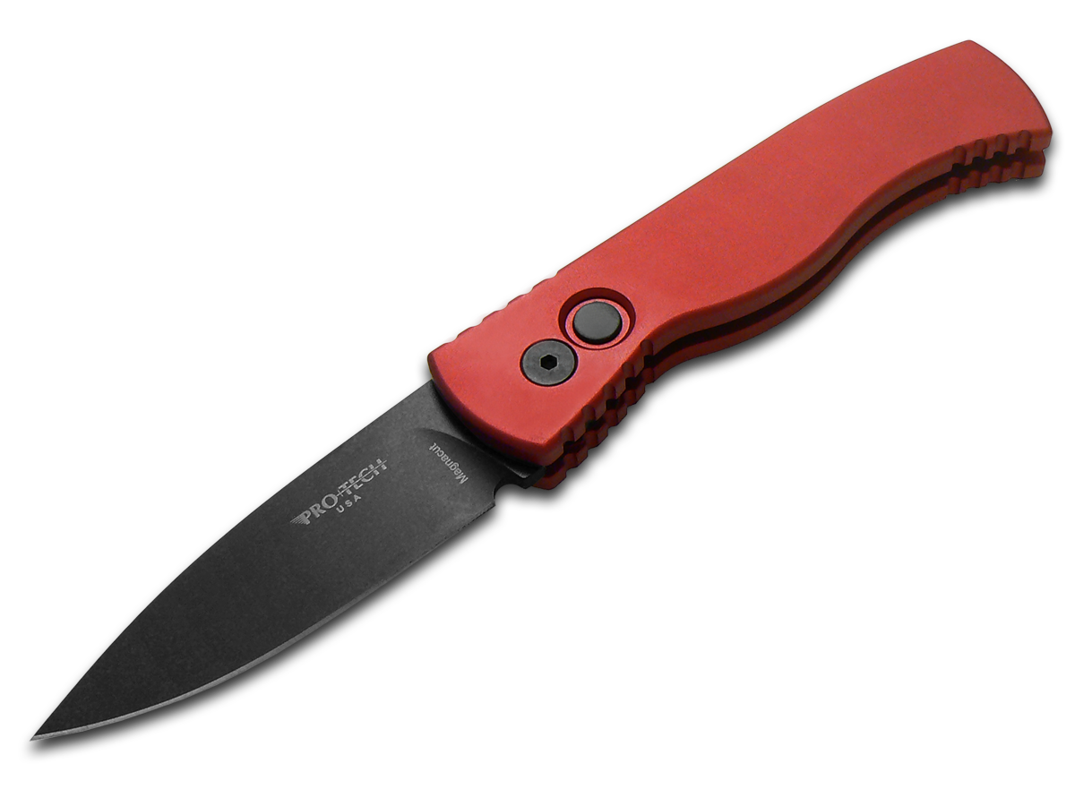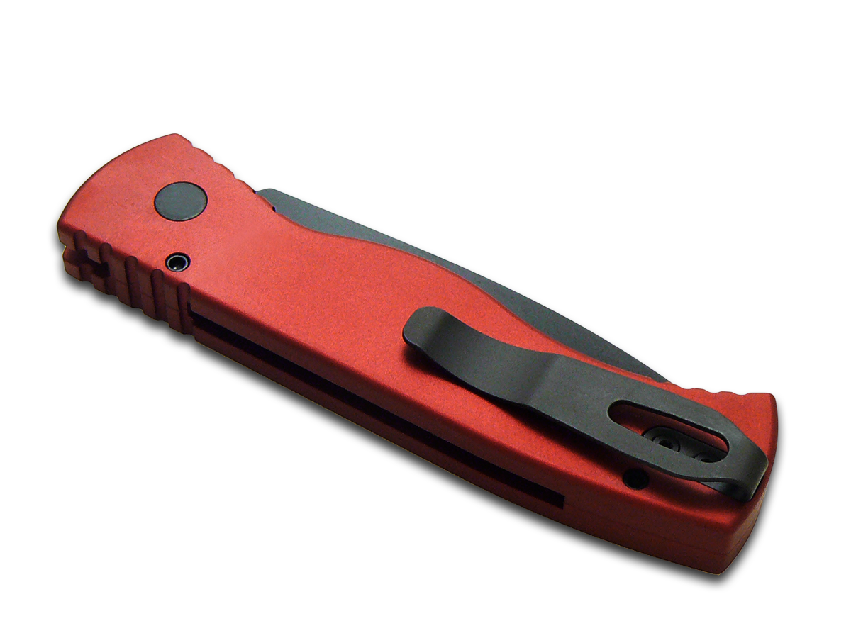 This Pro-Tech Knives, LLC Tactical Response 2 knife utilizes a 3 1/8" Locking Drop Point blade with a saber grind edge and 3.2mm thickness. The blade material is MagnaCut Stainless Steel with Black DLC finish. The contoured handle is Red 6061-T6 Aluminum with right-hand release button and right-carry tip-up pocket clip/lanyard hole. It's around 4 1/2 inches long (folded/closed) and weighs approximately 3.4 ounces. PayPal is restricted for this product.