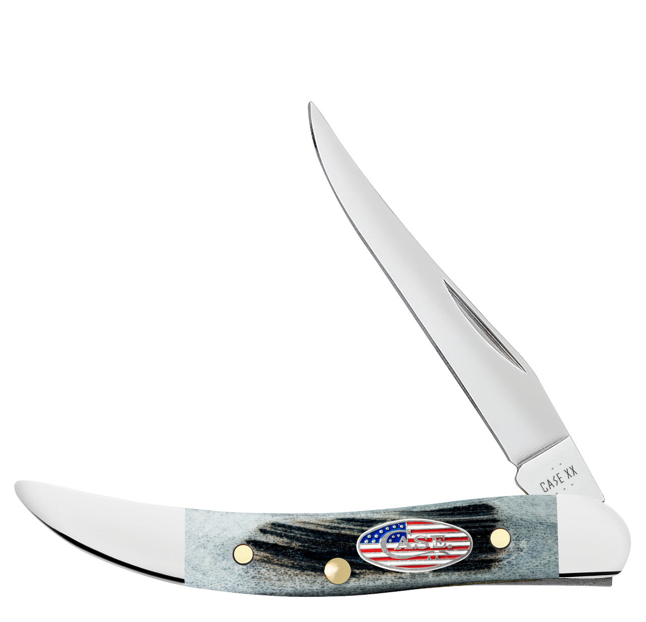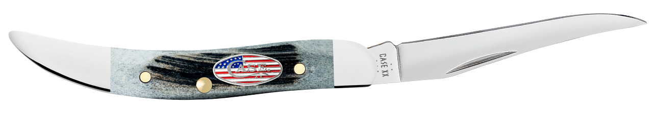 This W.R. Case & Sons Cutlery Co. Toothpick knife utilizes a 2 1/4" Long Clip blade. Stamped with pattern number 610096 SS, the blade material is Tru-Sharp Surgical Stainless Steel with a mirror-polished finish. The handle is Sawcut jigged Gray Bone with a Nickel Silver Oval Stars & Stripes Inlay...
