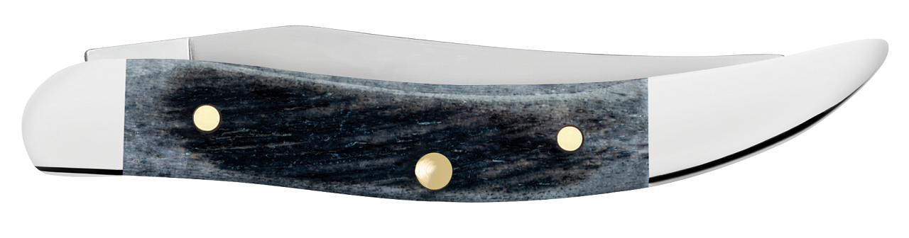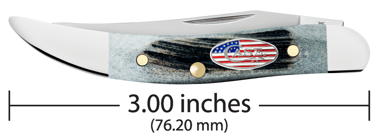 This W.R. Case & Sons Cutlery Co. Toothpick knife utilizes a 2 1/4" Long Clip blade. Stamped with pattern number 610096 SS, the blade material is Tru-Sharp Surgical Stainless Steel with a mirror-polished finish. The handle is Sawcut jigged Gray Bone with a Nickel Silver Oval Stars & Stripes Inlay shield. The bolsters are Highly polished Nickel Silver. It's around 3 inches long (folded/closed) and weighs approximately 0.9 ounces.