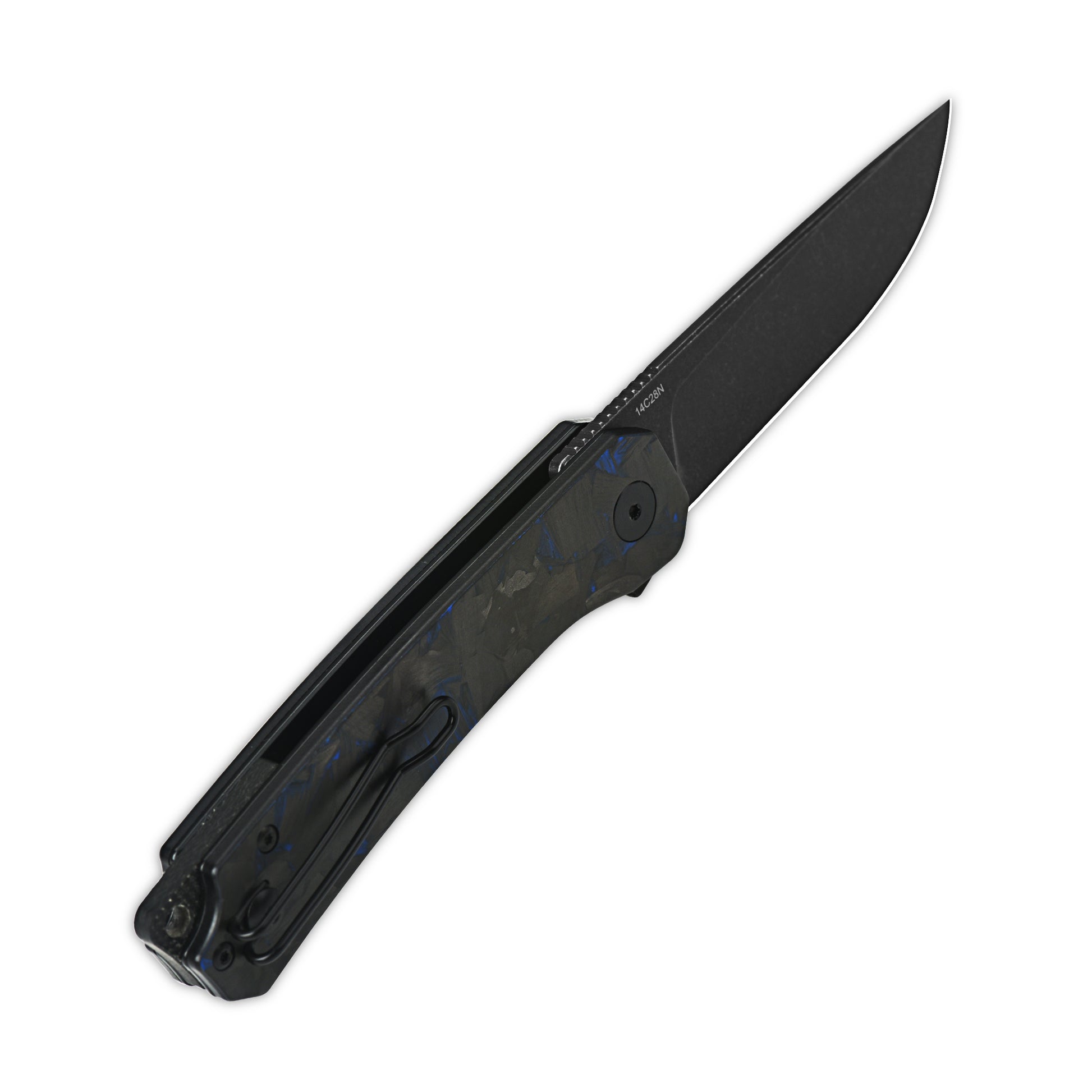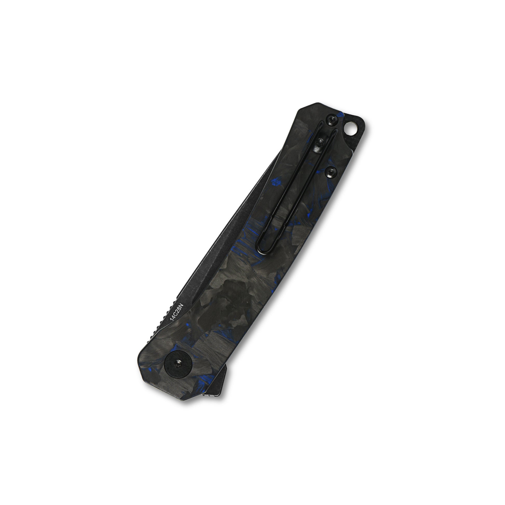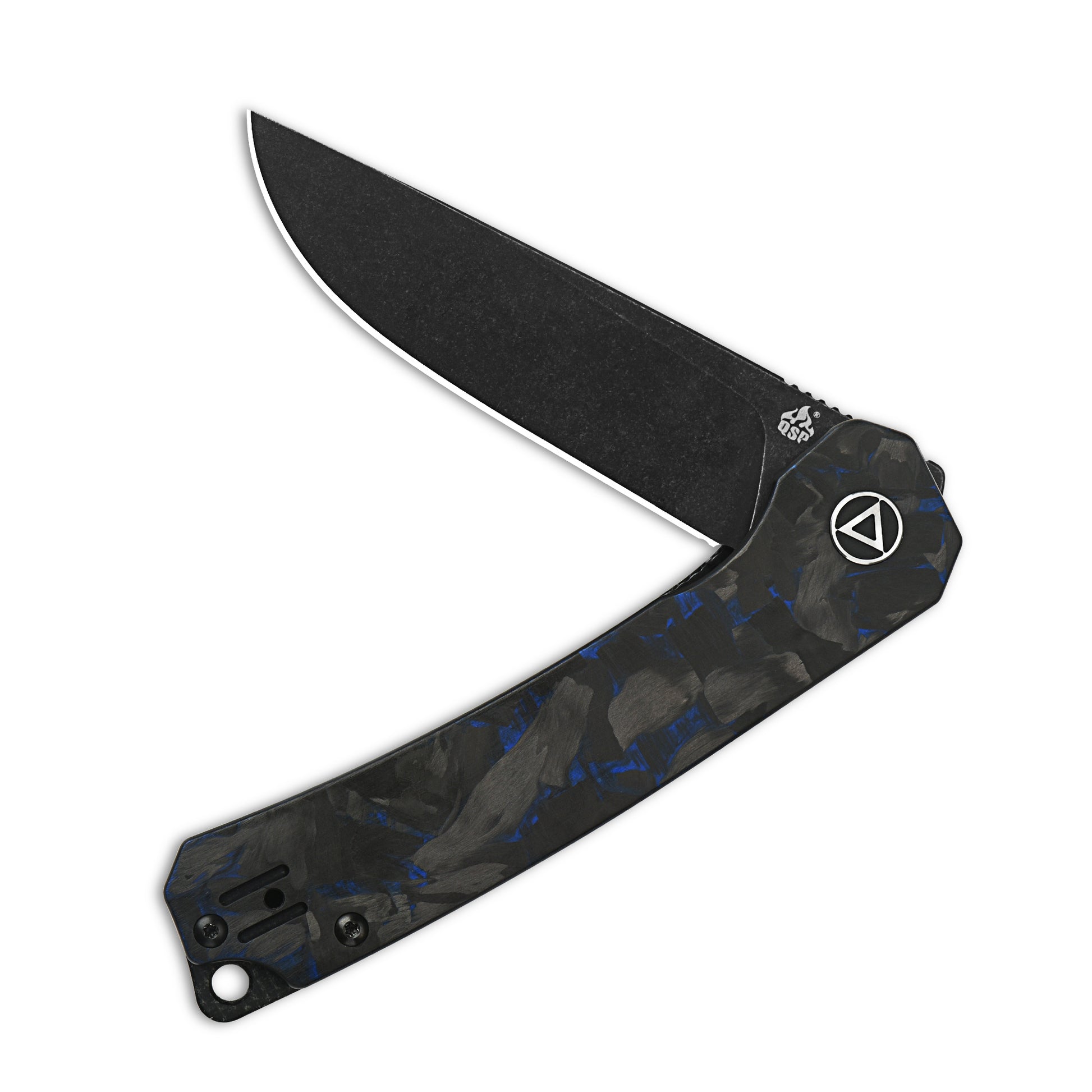 This QSP Knives Osprey Liner Lock knife utilizes a 3 1/4" Locking Straight-back Skinner blade with a plain edge, 3mm thickness and finger lever. The blade material is Sandvik 14C28N Stainless Steel with a Black Stonewashed finish. The handle is Black Shred Carbon Fiber and Blue G10 with a lanyard hole and reversible tip-up pocket clip. It's around 4 1/4 inches long (folded/closed) and weighs approximately 3.5 ounces. Handcrafted in China, this knife comes complete with Limited Lifetime Manufacturer's Warranty, a Padded Presentation Box.