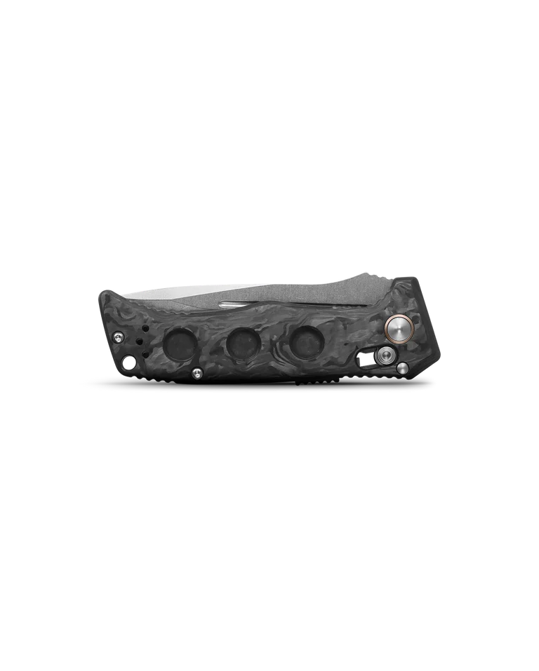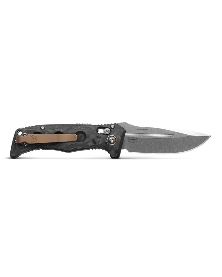 This Benchmade, Inc. Mini Auto Adamas knife utilizes a 3 1/4" Locking Drop Point blade with a plain edge, swedge, 3.6mm (0.14") thickness, fuller, thumb ramp, and spine jimping. The blade material is CPM-MagnaCut Stainless Steel with a Satin finish. The contoured handle is Black Marbled Carbon Fiber with an ambidextrous Auto Axis lock, weight-reduction milling, reversible tip-up pocket clip, finger guard and a lanyard hole. It's around 4 3/8 inches long (folded/closed) and weighs approximately 4.6 ounces. PayPal is restricted for this product.