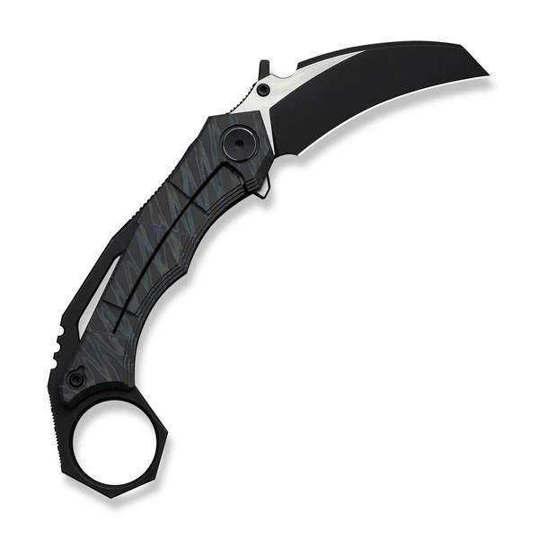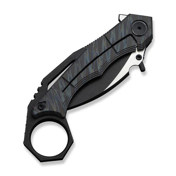 This WE Knife Co., Ltd Tayra Frame Lock Karambit knife utilizes a 2 1/4" Locking Hawkbill blade with a flat grind, 4mm (0.16") thickness, finger choil, thumb ramp jimping, finger lever, and pocket hook. The blade material is M390 Stainless Steel (58-60HRC) with a Black Stonewashed finish and Satin flats. The contoured handle is Tiger Stripe Flamed 6AL4V Titanium with a reversible tip-up Titanium pocket clip, Black Titanium spacer and finger hoop. It's around 4 5/8 inches long (folded/closed) and weighs approximately 3.4 ounces. Handcrafted in China, this knife comes complete with Limited Lifetime Manufacturer's Warranty, Storage Pouch and Box.