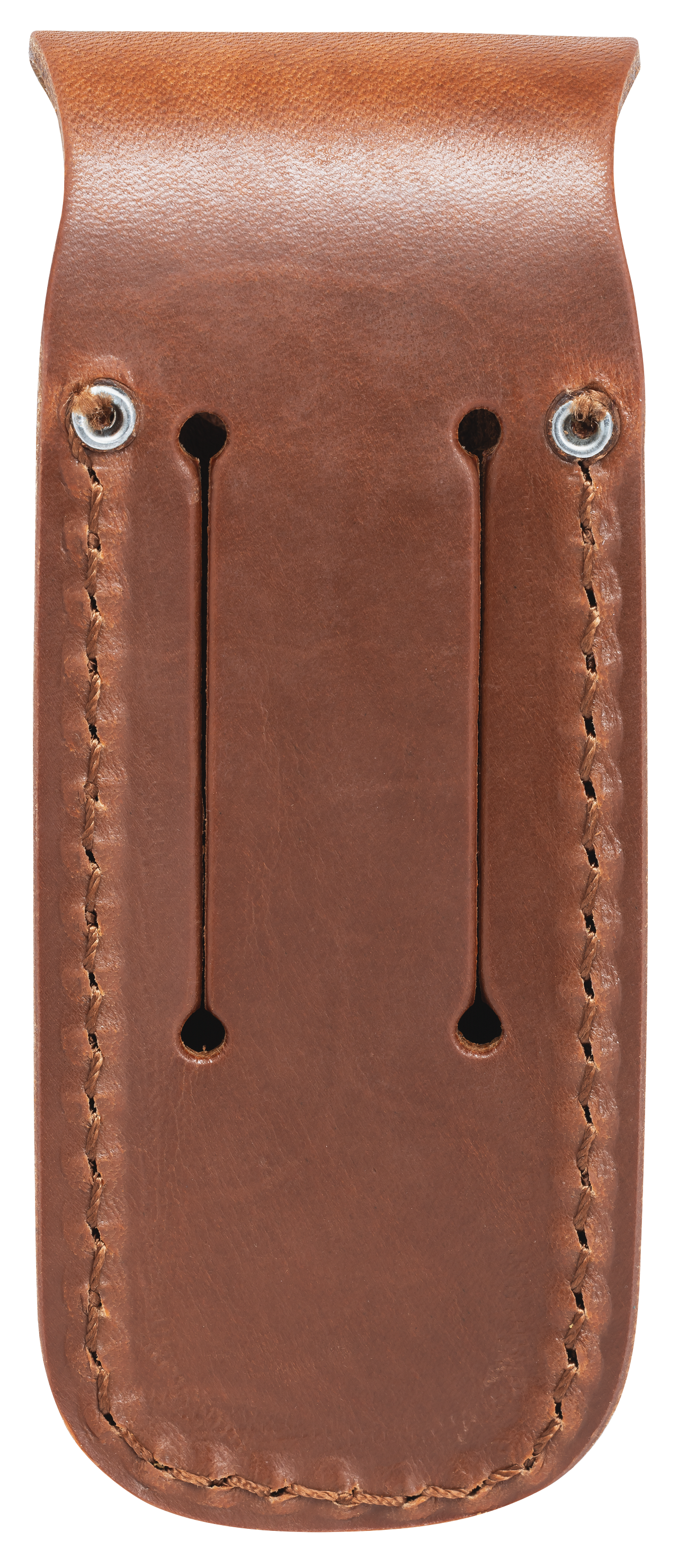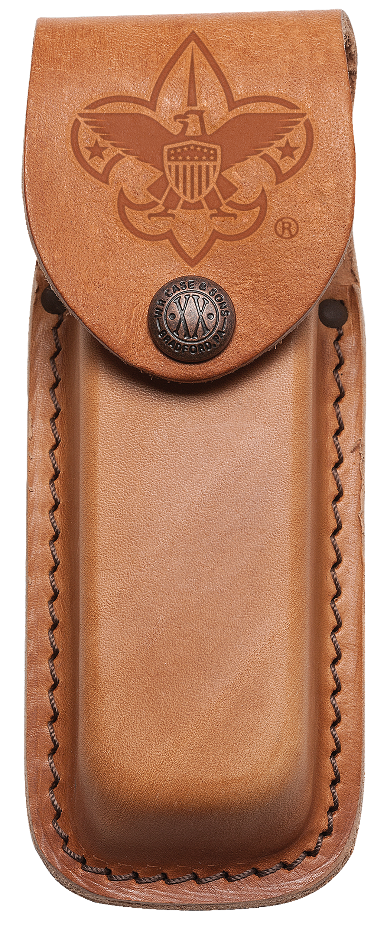This button snap Belt Sheath was developed by W.R. Case & Sons Cutlery Co.. It is made from high-quality Brown Leather and measures 5"L X 2"W X 1 1/4"H. This sheath fits large Case knives, like the Trapper and Large Stockman.