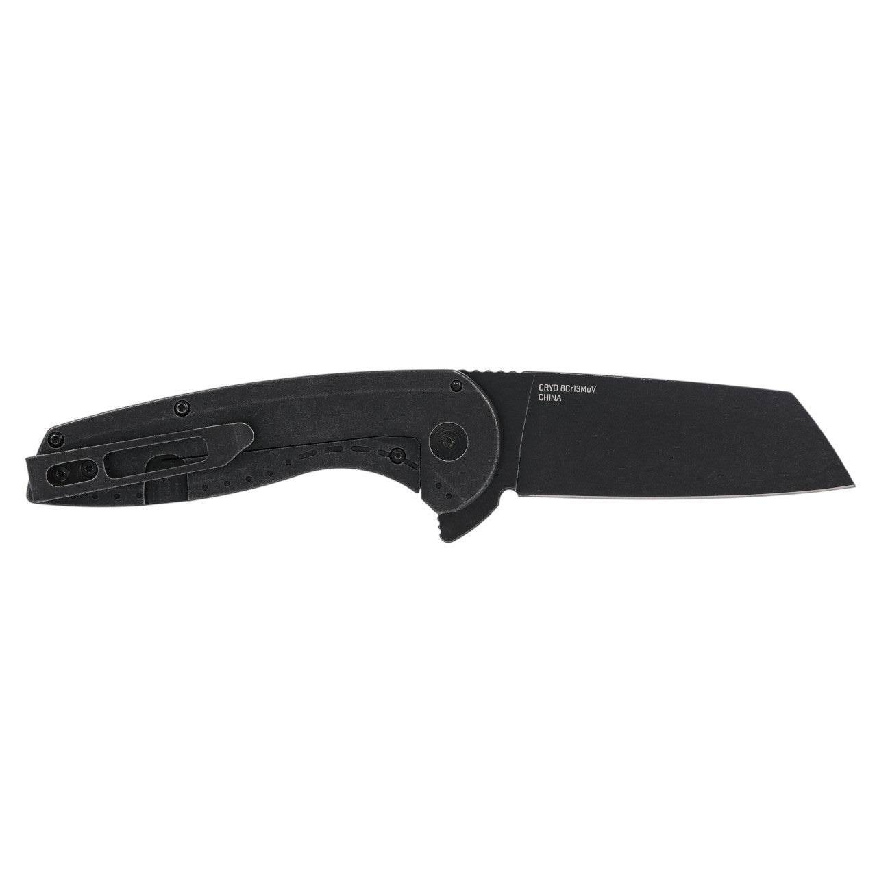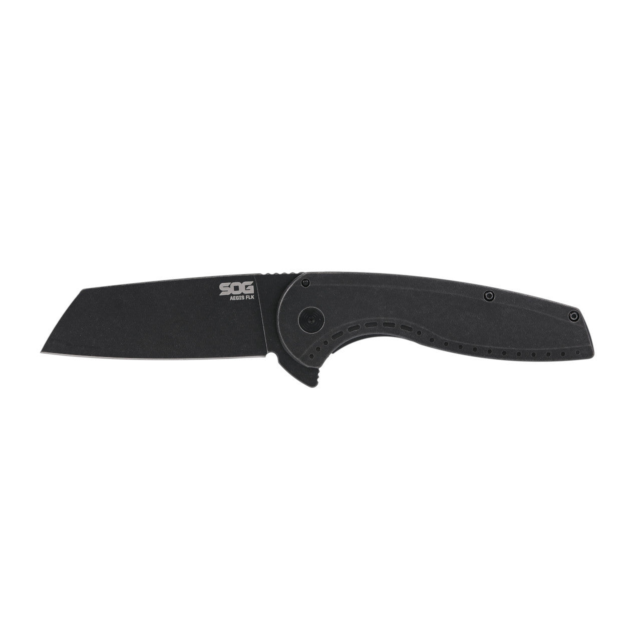This SOG Specialty Knives Aegis FLK 2.0 Frame Lock knife utilizes a 3 1/4" Locking Warncliffe blade with a recurve edge, swedge, 2.8mm thickness and finger lever. The blade material is 8Cr13MoV Stainless Steel with Black Stonewash PVD coating. The handle is Blackwash 410 Stainless Steel with a removable right-carry pocket clip. It's around 4 3/4 inches long (folded/closed) and weighs approximately 5.2 ounces.