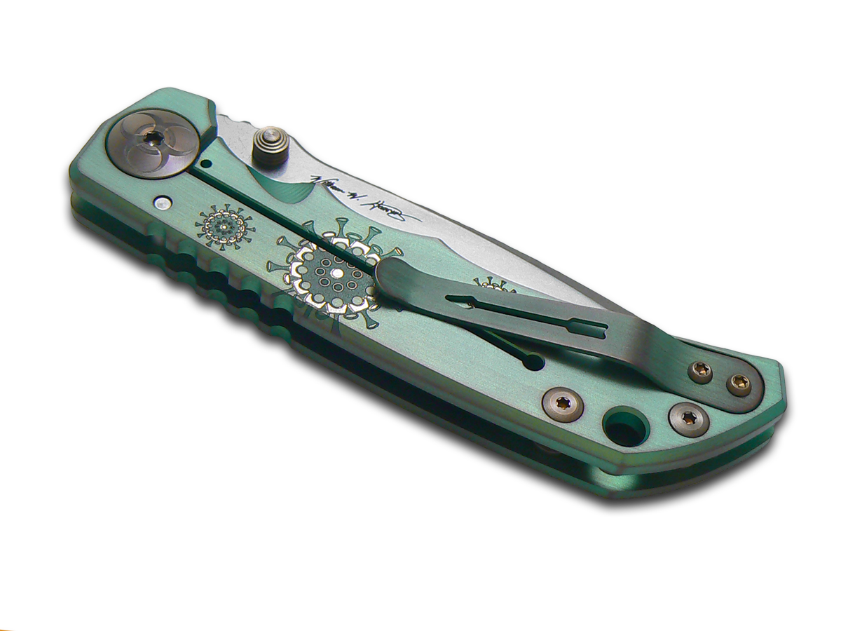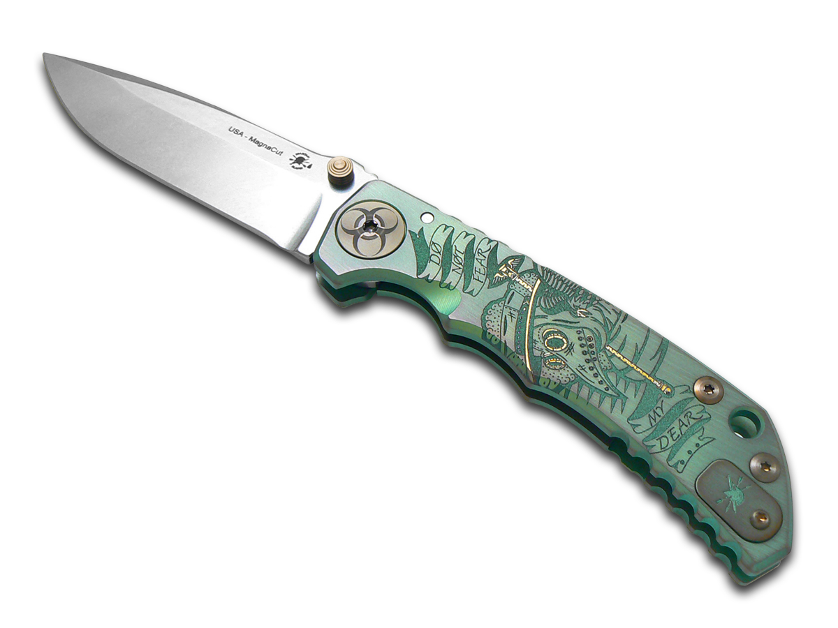 This Spartan Blades, LLC Harsey Folder Frame Lock knife utilizes a 4" Locking Drop Point blade with a plain edge, flat grind, swedge, 3.8mm thickness, thumb studs, and thumb ramp jimping. The blade material is 'Double Deep' Cryo-treated CPM MagnaCut Stainless Steel (61-63 HRC) with a Stonewashed finish and William W. Harsey signature. The contoured handle is Aged Green Anodized 6AL4V Titanium with Bronzed hardware, jimping, lanyard hole, reversible tip-up pocket clip, and is deeply engraved with colorful Plague Doctor graphics on both sides. It's around 4 3/4 inches long (folded/closed) and weighs approximately 5.9 ounces....