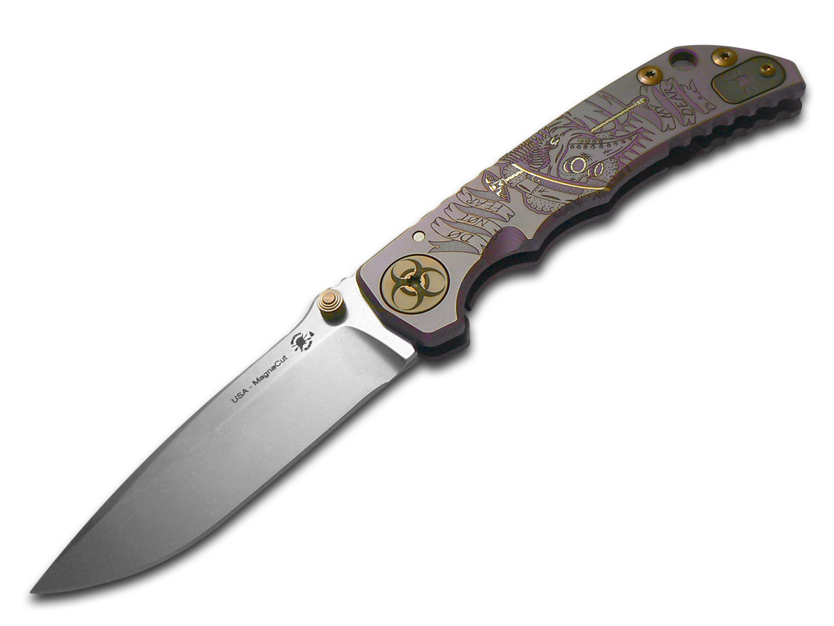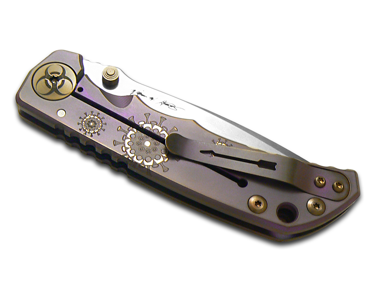 This Spartan Blades, LLC Harsey Folder Frame Lock knife utilizes a 4" Locking Drop Point blade with a plain edge, flat grind, swedge, 3.8mm thickness, thumb studs, and thumb ramp jimping. The blade material is 'Double Deep' Cryo-treated CPM MagnaCut Stainless Steel (61-63 HRC) with a Stonewashed finish and William W. Harsey signature. The contoured handle is Purple Anodized 6AL4V Titanium with bronzed Titanium hardware, jimping, a lanyard hole, reversible tip-up pocket clip, and is deeply engraved with colorful Plague Doctor graphics on both sides. It's around 4 3/4 inches long (folded/closed) and weighs approximately 5.9 ounces....
