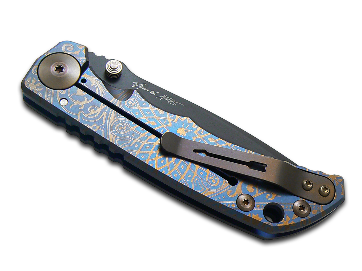 This Spartan Blades, LLC Harsey Folder Frame Lock knife utilizes a 4" Locking Drop Point blade with a plain edge, flat grind, swedge, 3.8mm thickness, thumb studs, and thumb ramp jimping. The blade material is 'Double Deep' Cryo-treated CPM MagnaCut Stainless Steel (61-63 HRC) with a Black PVD coating and William W. Harsey signature. The contoured handle is Bronze Anodized 6AL4V Titanium with Bronzed hardware, jimping, lanyard hole, reversible tip-up pocket clip, and is etched with blue Royal Flush graphic on the front side and Playing Card graphic on the back side. It's around 4 3/4 inches long (folded/closed) and weighs approximately 5.9 ounces....