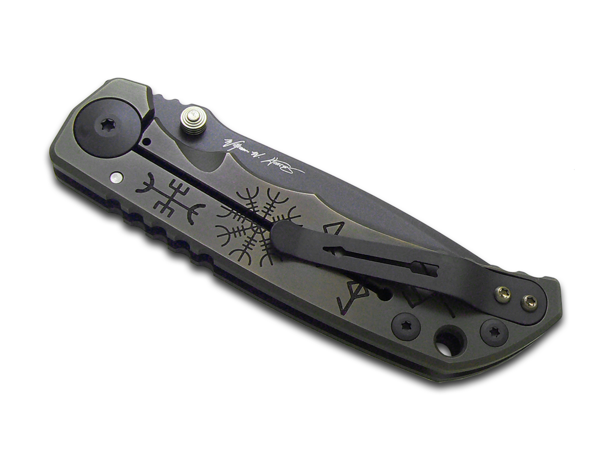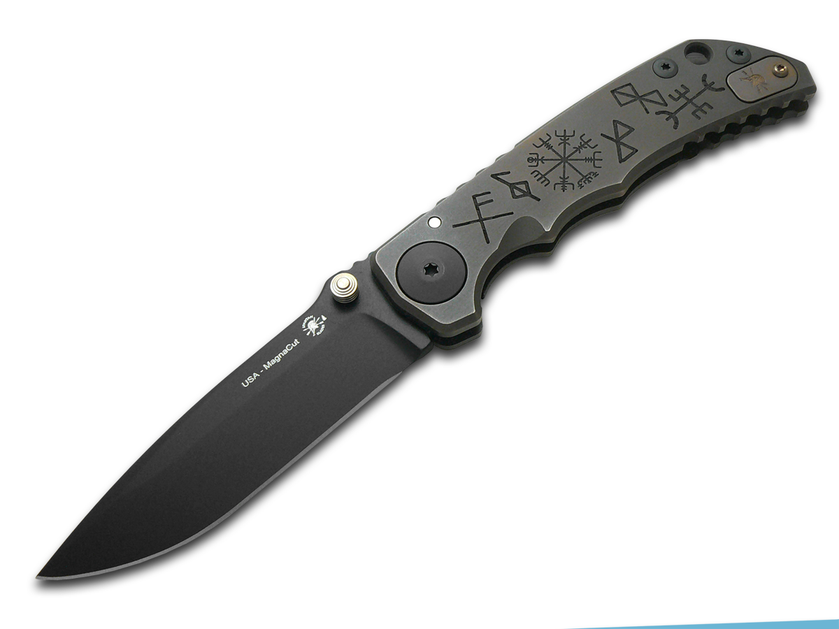 This Spartan Blades, LLC Harsey Folder Frame Lock knife utilizes a 4" Locking Drop Point blade with a plain edge, flat grind, swedge, 3.8mm thickness, thumb studs, and thumb ramp jimping. The blade material is 'Double Deep' Cryo-treated CPM MagnaCut Stainless Steel (61-63 HRC) with a Black PVD coating and William W. Harsey signature. The contoured handle is Bronze Anodized 6AL4V Titanium with Bronzed hardware, jimping, lanyard hole, reversible tip-up pocket clip, and is deeply engraved with Viking Runes & Staves on both sides. It's around 4 3/4 inches long (folded/closed) and weighs approximately 5.9 ounces....