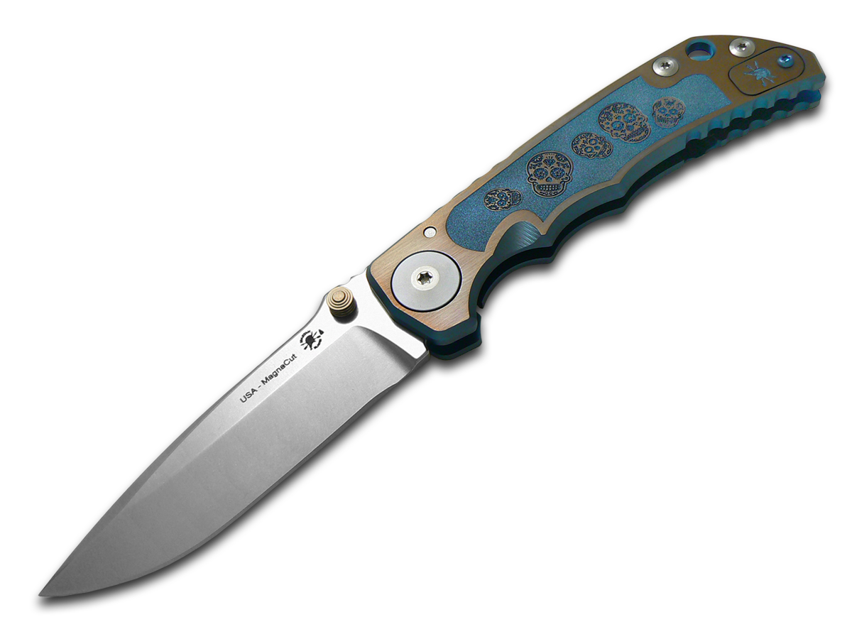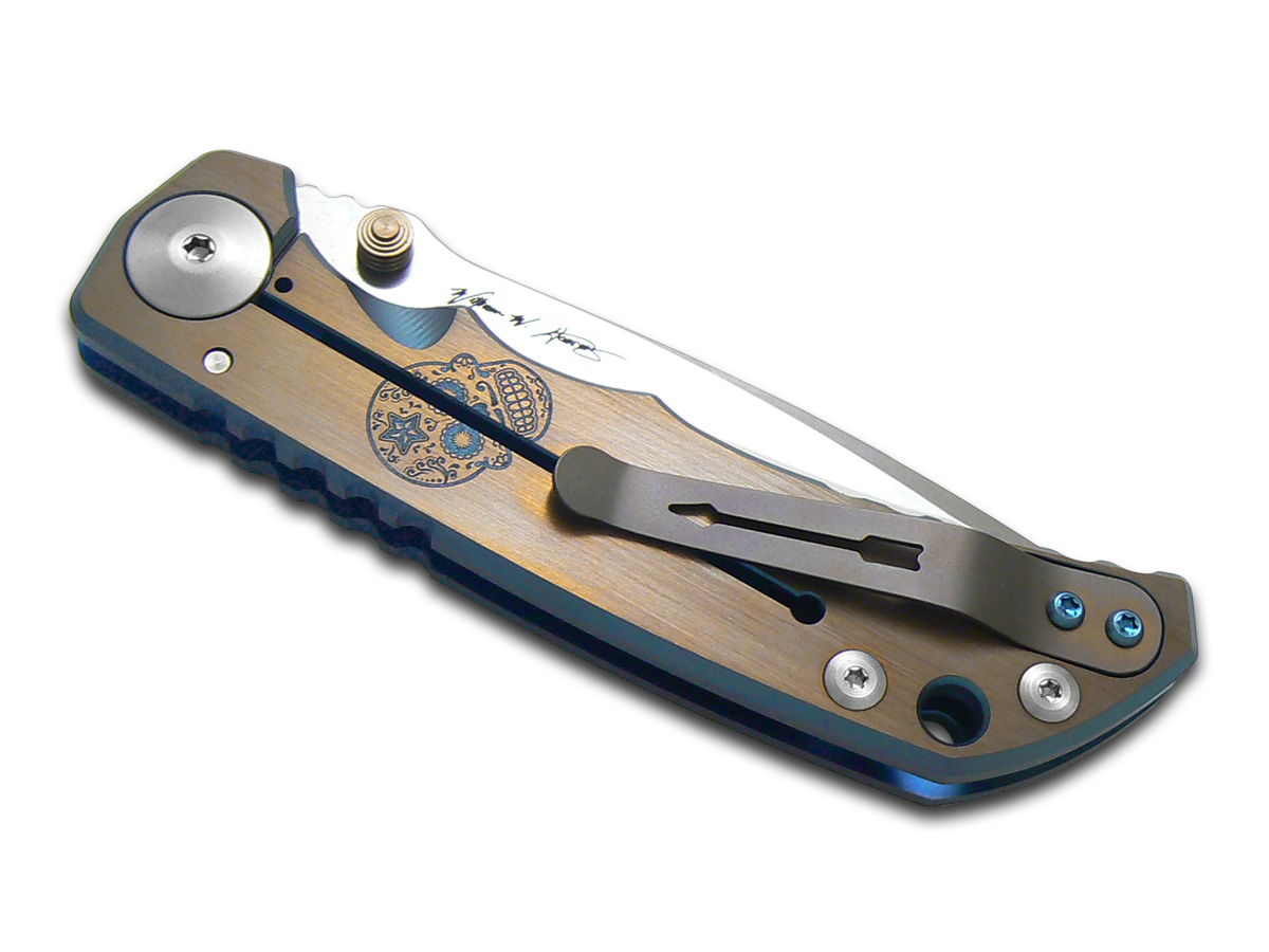 This Spartan Blades, LLC Harsey Folder Frame Lock knife utilizes a 4" Locking Drop Point blade with a plain edge, flat grind, swedge, 3.8mm thickness, thumb studs, and thumb ramp jimping. The blade material is 'Double Deep' Cryo-treated CPM MagnaCut Stainless Steel (61-63 HRC) with a Stonewashed finish and William W. Harsey signature. The contoured handle is Blue Anodized 6AL4V Titanium with Bronzed Satin flats, polished hardware, jimping, lanyard hole, reversible tip-up pocket clip, and is deeply engraved with blue Sugar Skulls on both sides. It's around 4 3/4 inches long (folded/closed) and weighs approximately 5.9 ounces....
