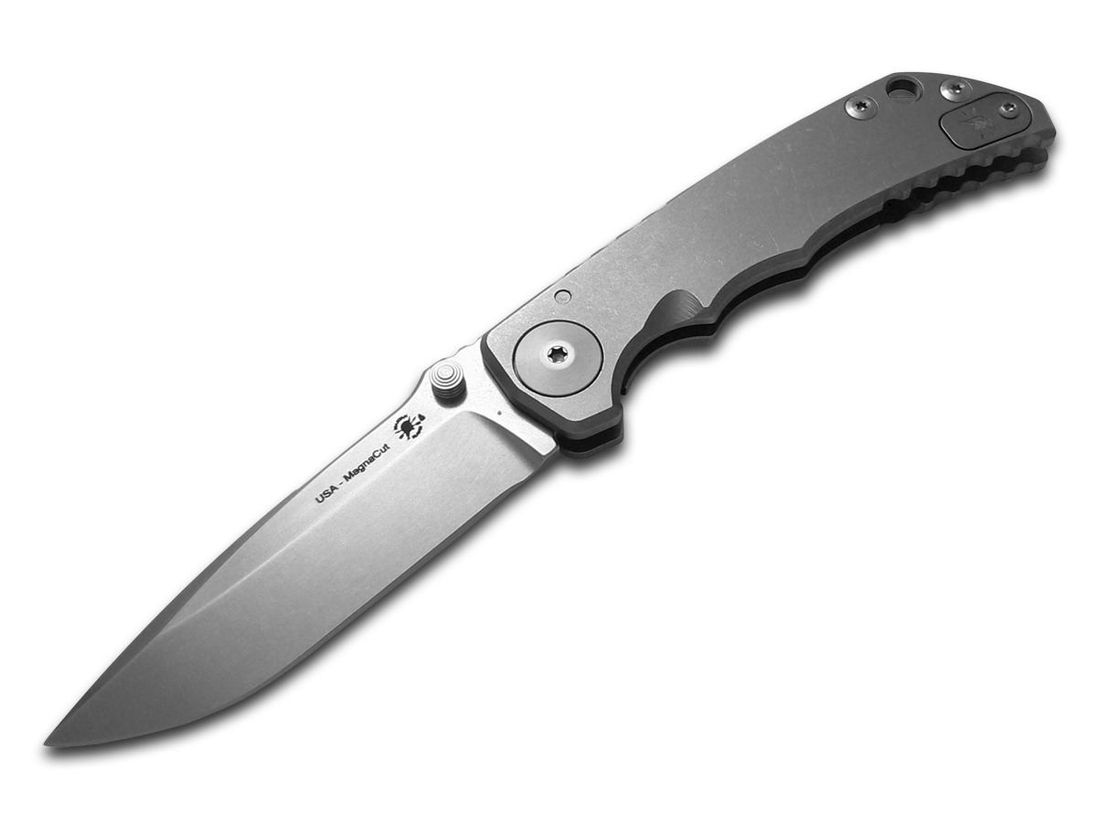 This Spartan Blades, LLC Harsey Folder Frame Lock knife utilizes a 4" Locking Drop Point blade with a plain edge, swedge, 3.8mm thickness, thumb studs, and thumb ramp jimping. The blade material is 'Double Deep' Cryo-treated CPM MagnaCut Stainless Steel (61-63 HRC) with a Stonewashed finish. The contoured handle is Polished 6AL4V Titanium with jimping, a lanyard hole and reversible tip-up pocket clip. It's around 4 3/4 inches long (folded/closed) and weighs approximately 5.9 ounces.